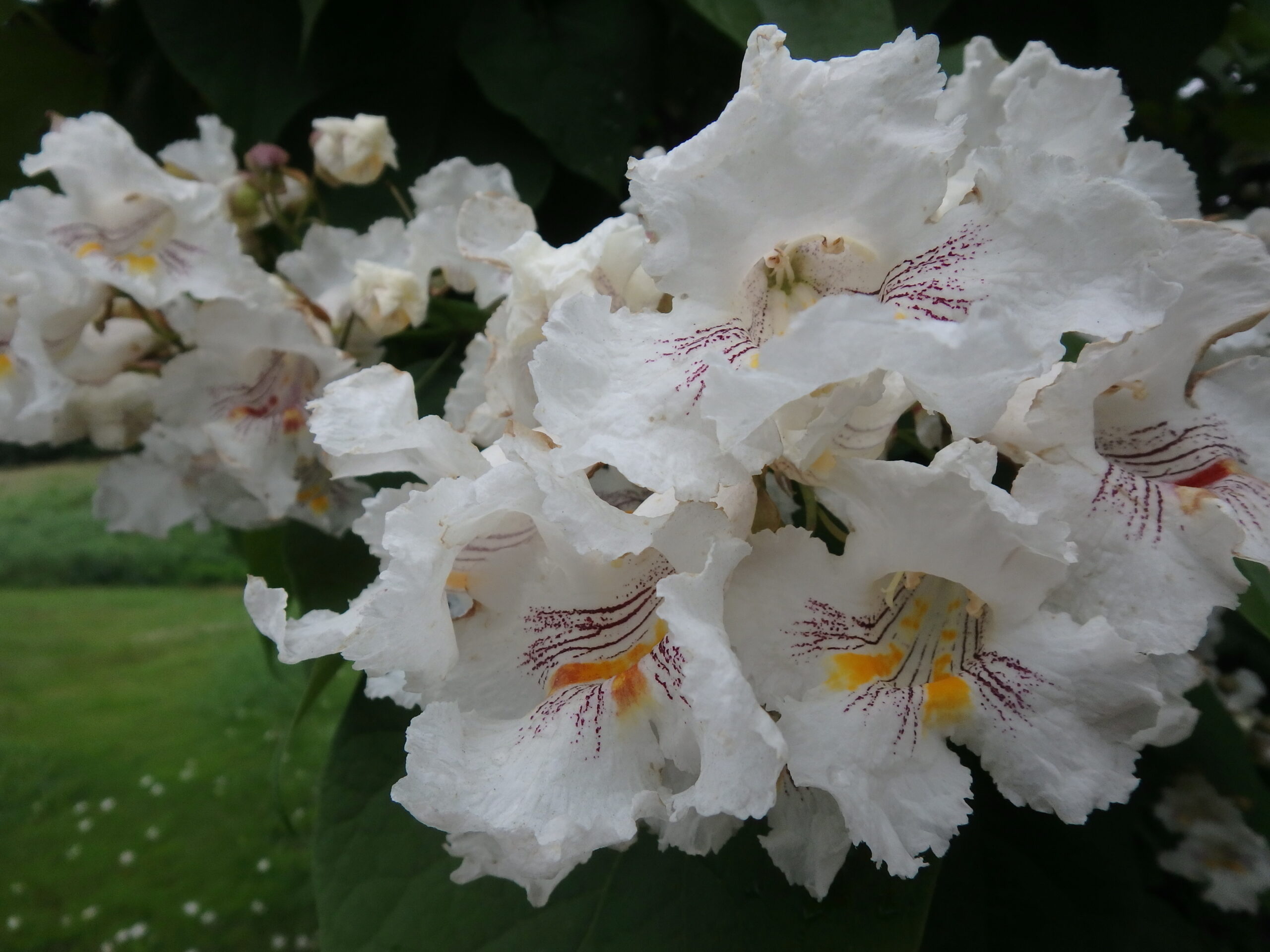 Want a fast-growing flowering tree? Plant a catalpa. They are native and the flowers are amazing. Fragrant, attractive. The leaves are huge – big enough that Native Americans used them for diapers for babies, I’ve read. I bought a 10-footer five years ago and now it already a shade tree – 25 feet tall with a 20-foot wide crown.