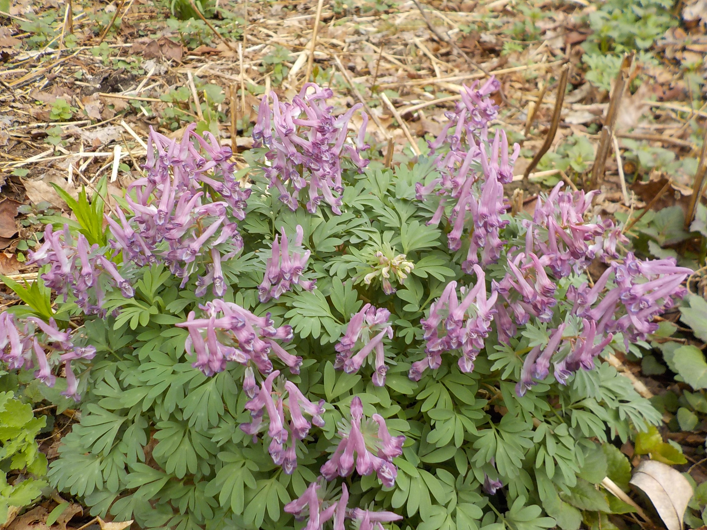 A dainty flower with beautiful finely-cut foliage is a spring ephemeral called corydalis or fumewort (Corydalis solida). It pops up in my garden where it wishes, and I am always glad to welcome it. It seems to do best in moist, part shade with rich soil. The flowers on mine are small, long-spurred light blue, but other colors are also possible. There is a yellow variety of a related species (C. lutea).