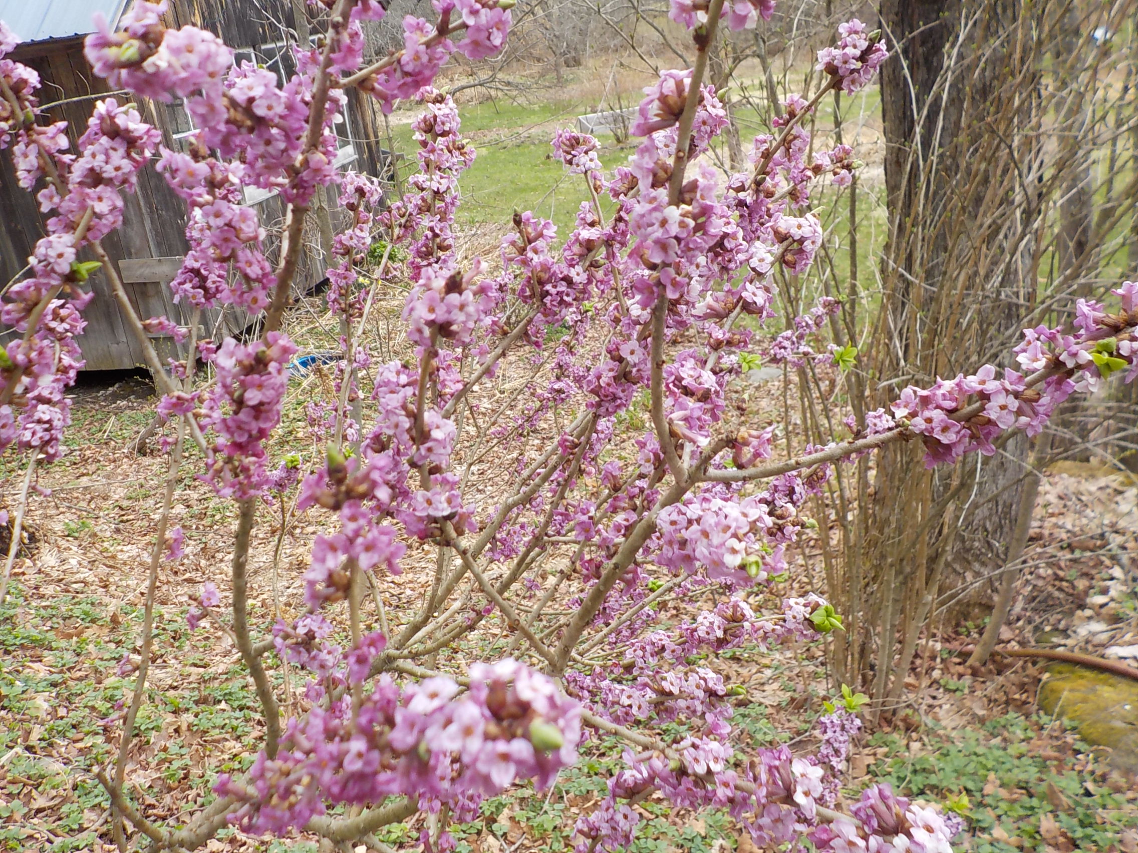 February Daphne (Daphne mezereum) is in bloom now with highly fragrant pinky-purple flowers. It is originally from Europe, Turkey and Iran. I love it so much I named a corgi after it (she is now gone, alas). It stays 3-5-feet tall and wide. In the fall it has produces small red berries.
