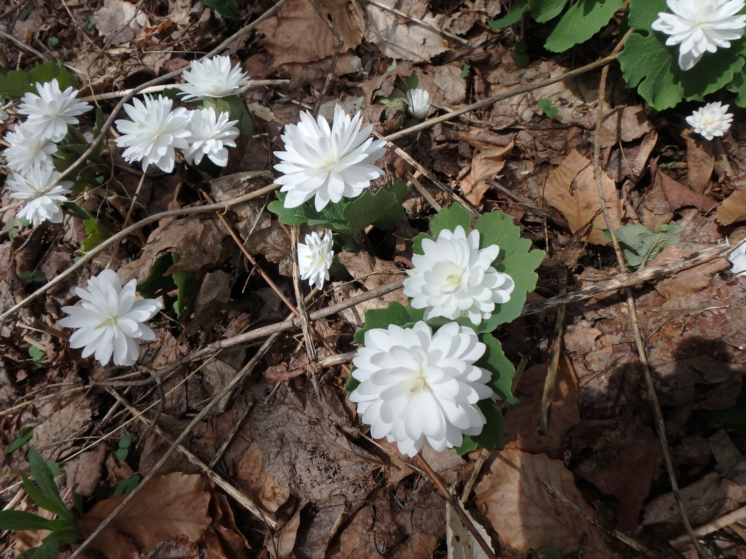 The bloom season of bloodroot is short, but there is double bloodroot which is sterile and blooms for a longer time. Like all bloodroots, the clumps get bigger every year, so you can dig them up and divide them to start doubles in new places. The sap from the roots is poisonous, so wear gloves when dividing any bloodroots. Do that in now, or in the fall.