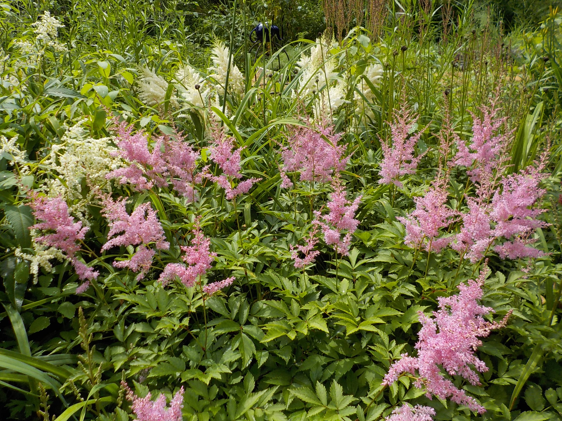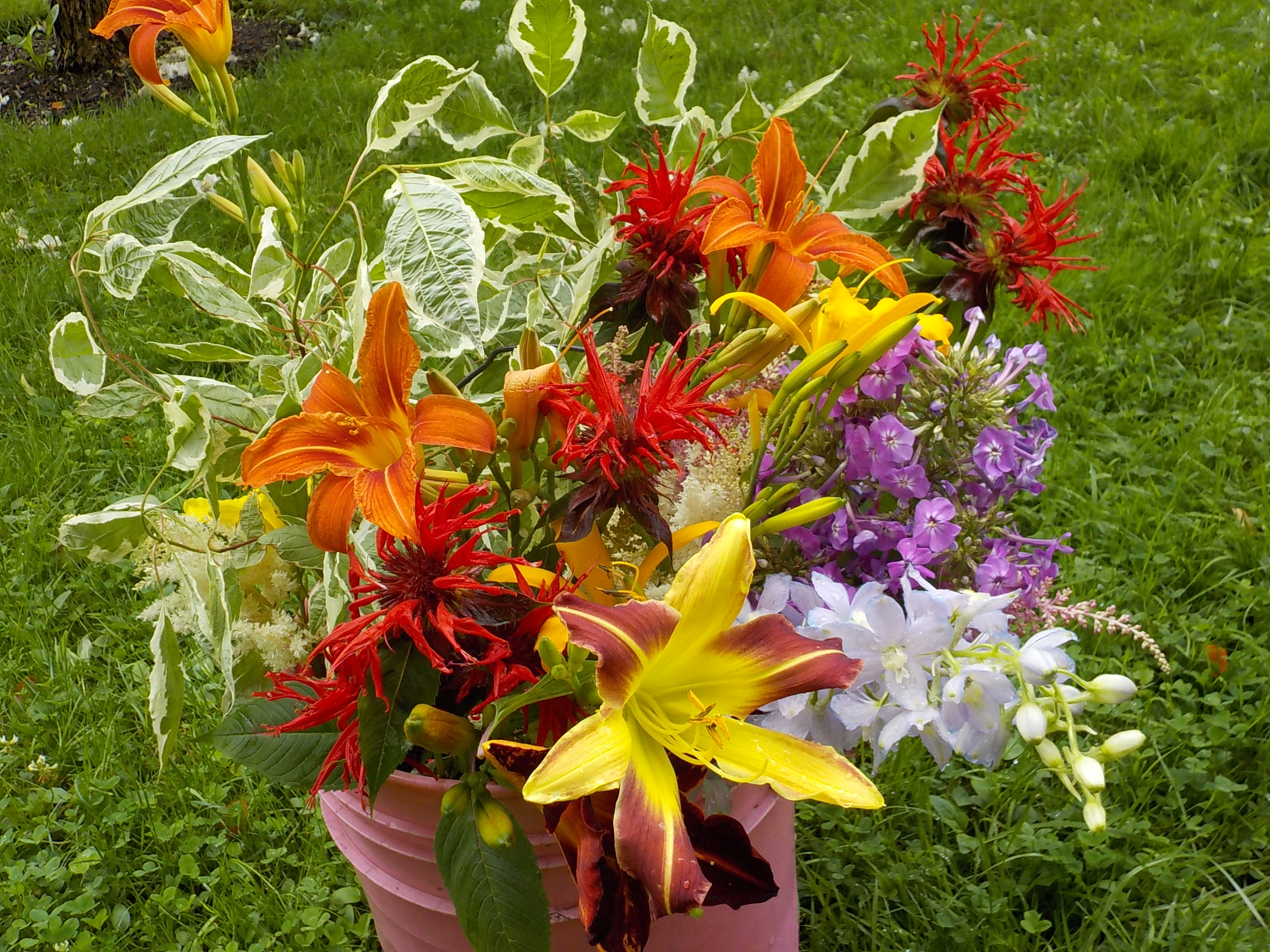 What is blooming now that will look good in a vase? I love delphinium, astillbe, daylilies, roses, bee balm, phlox and Shasta daisies. All will last well in a vase, and provide plenty of height for a tall vase.
