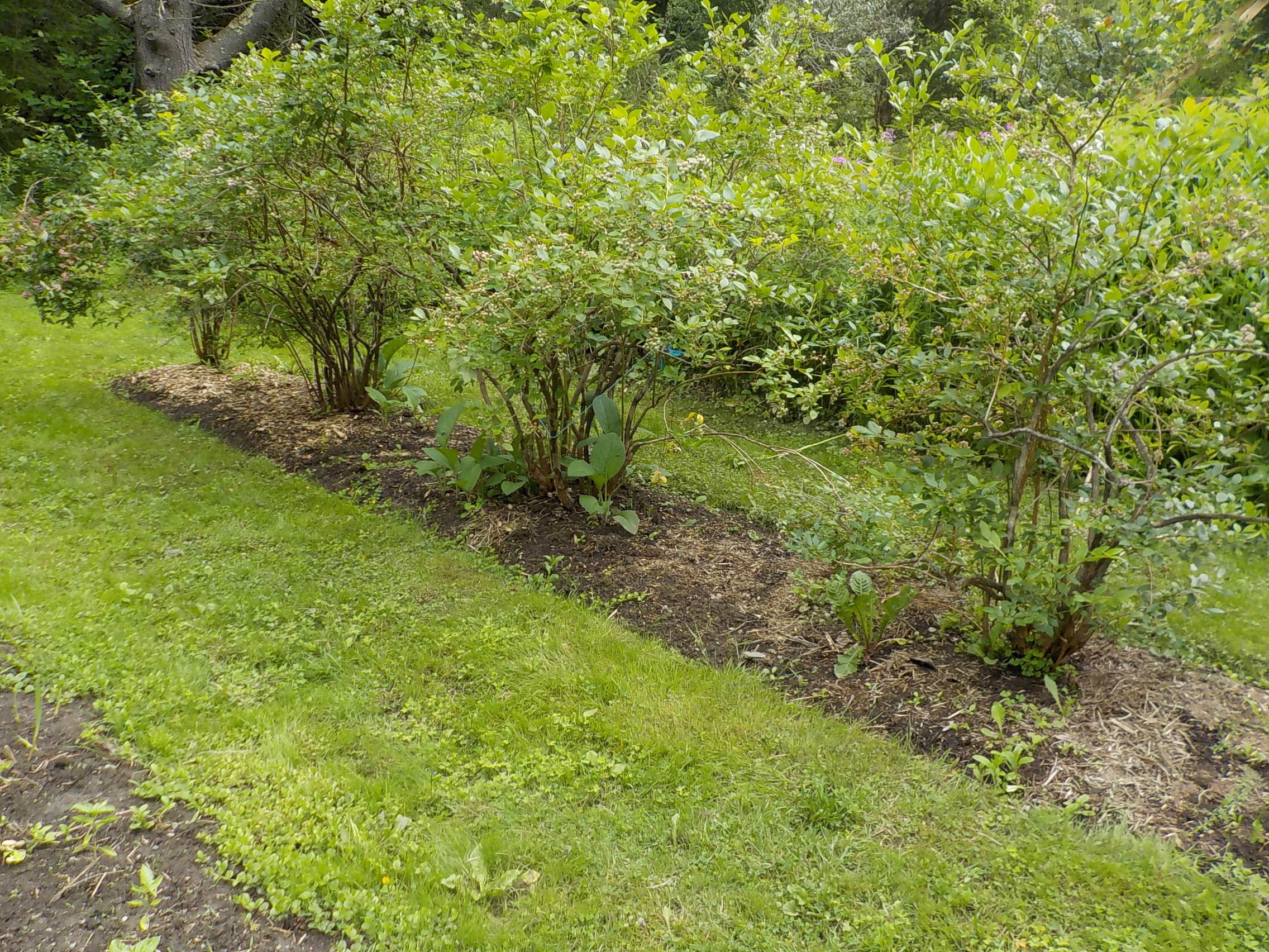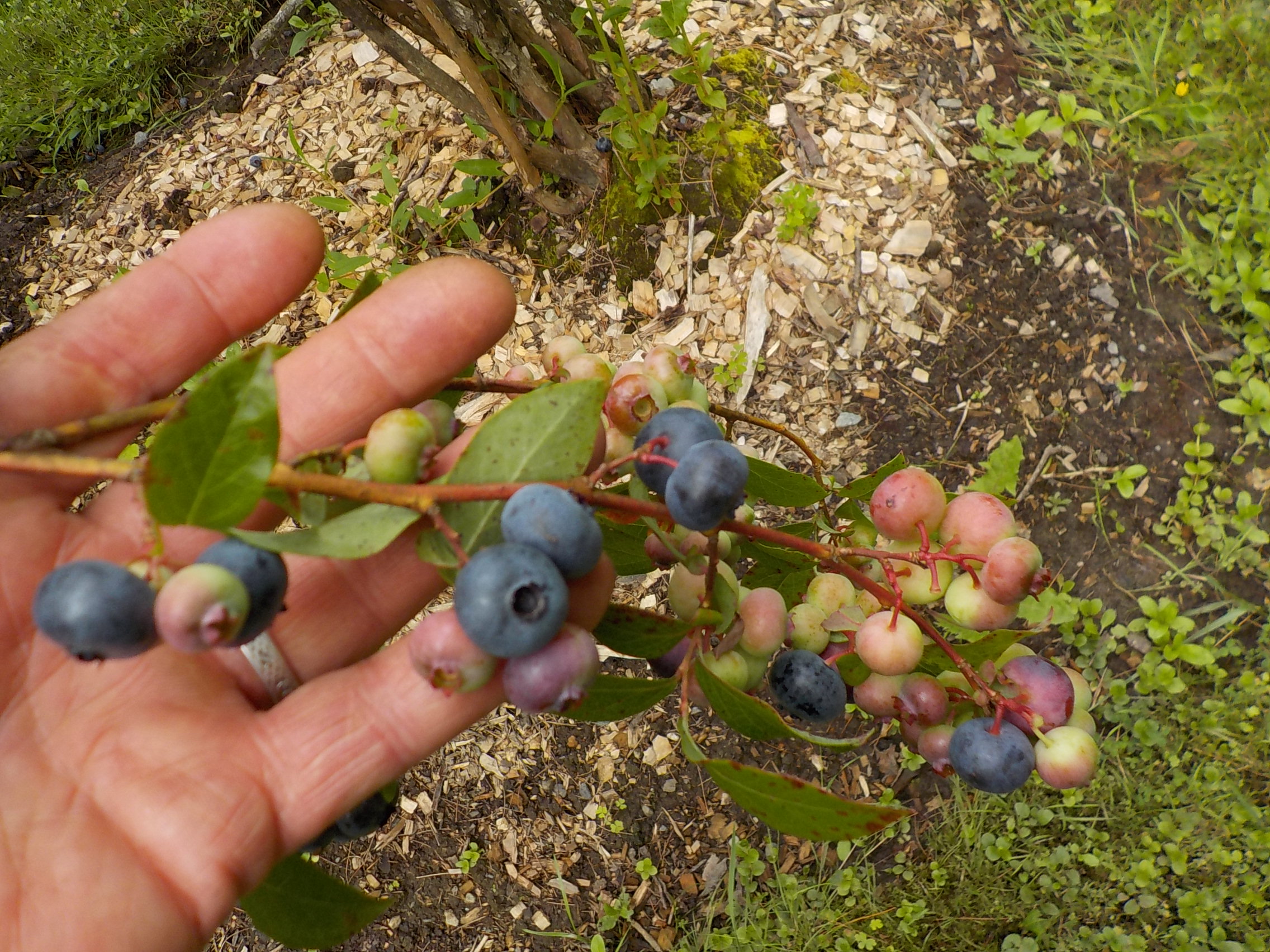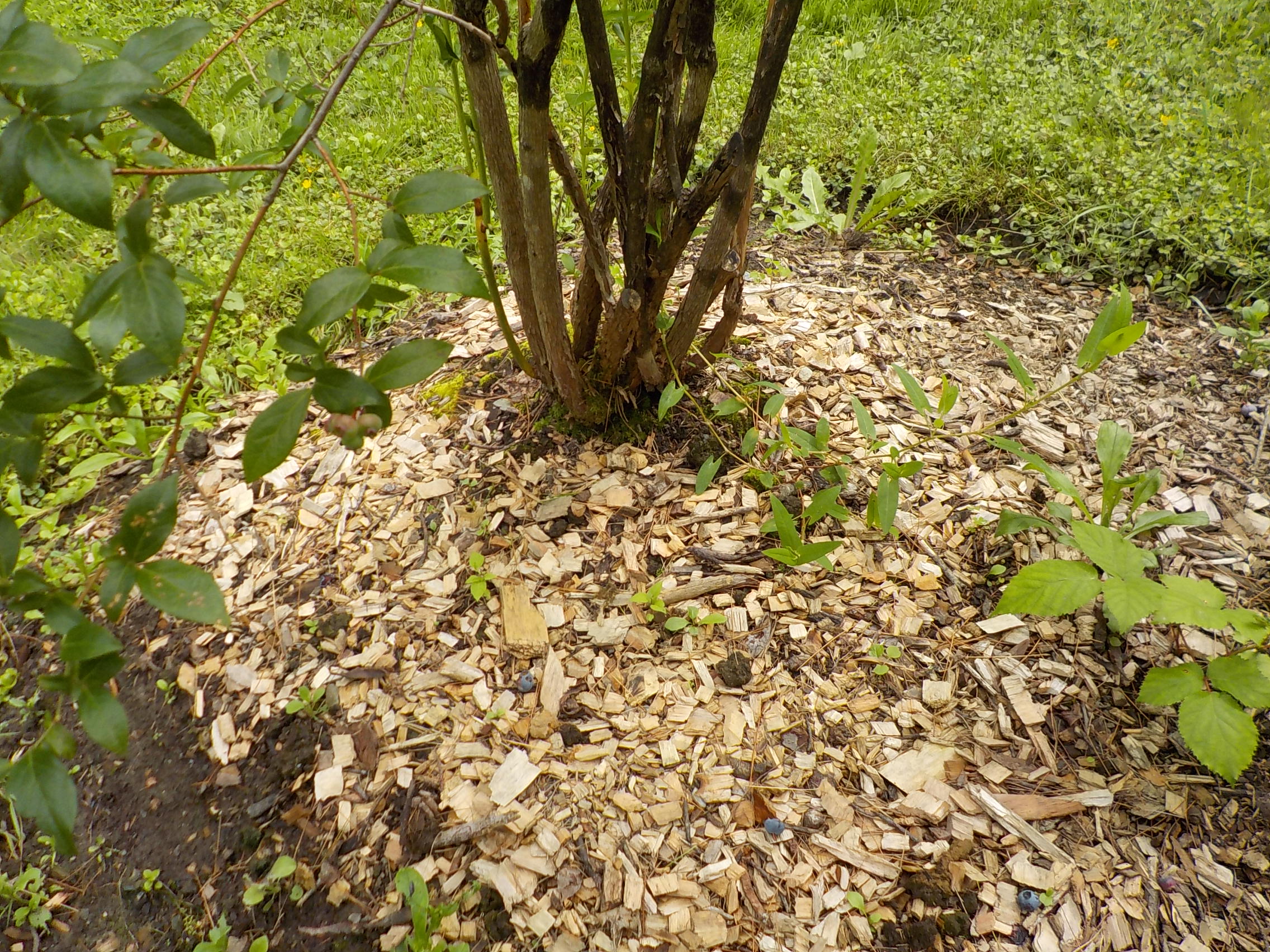 Blueberries do not like weeds, so do a good job of pulling out the grasses and weeds in the place you plant your berries – before you plant. And then add a good thick layer of wood chips around the plants to discourage weeds in the future.