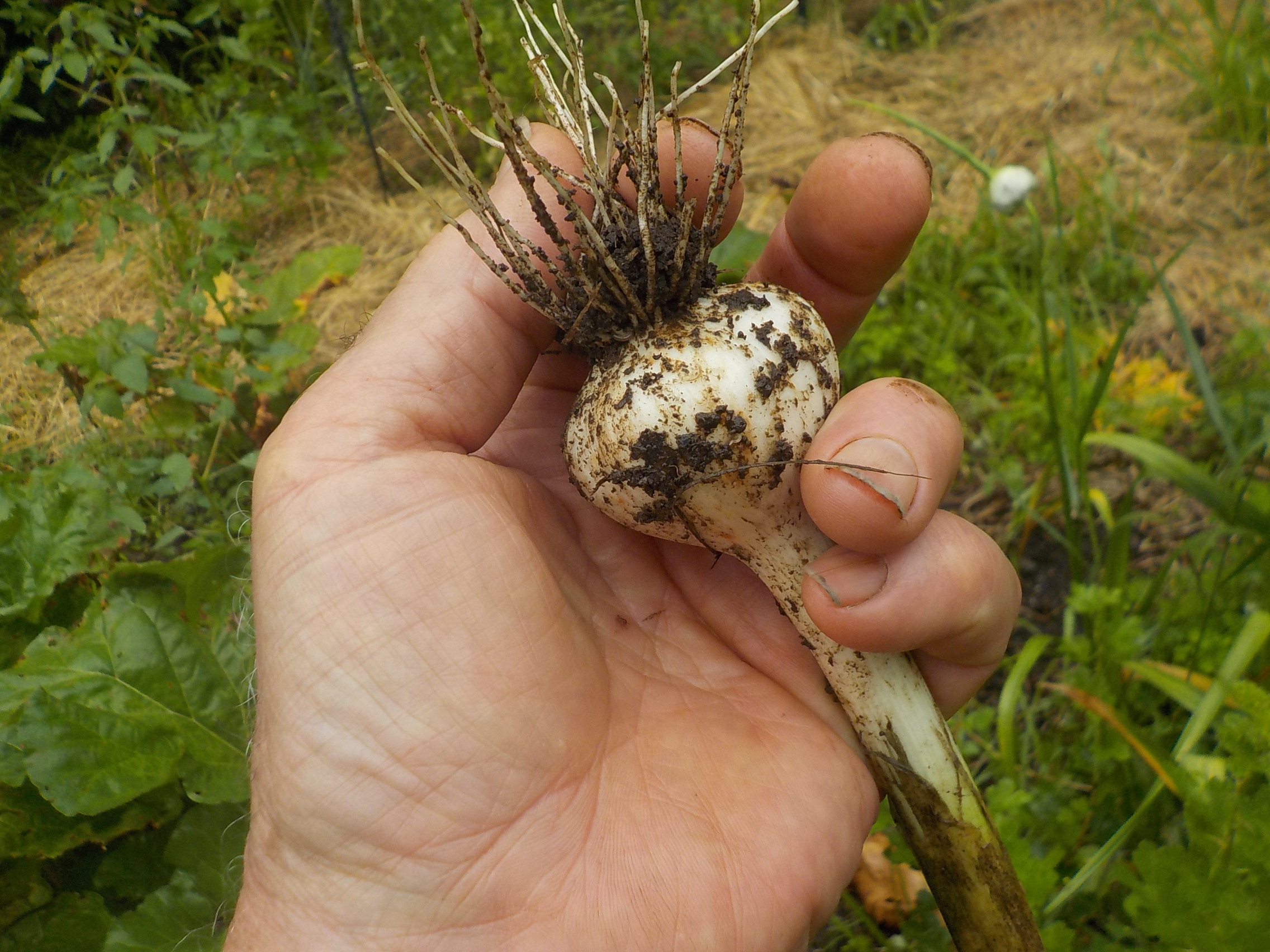 Here’s what I do: I start by groping my garlic: I slip my hand into the soil and feel how big the bulbs are. I don’t pull them if they’re tiny. But to be on the safe side, I pull a few and look at the skin over the cloves. I want the skins to be strong and tight for good storage. If they are breaking down (due to all the rain), I pull my garlic. If not, I let them keep growing, but check them often.