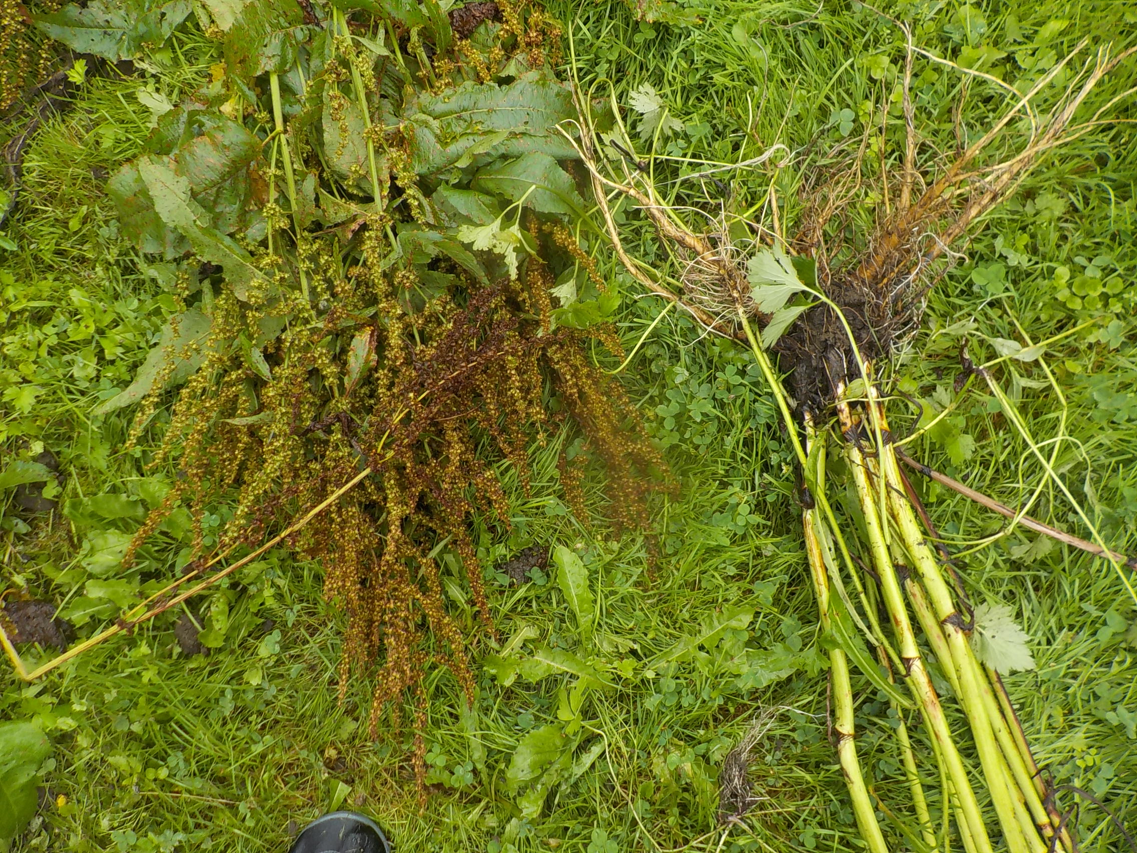 I worked on those dock plants now as they had already flowered and had formed seeds – which I don’t want in the soil. If pressed for time, I could have just cut the plants at ground level so the seeds would not be dispersed, but I favored pulling the weeds and getting rid of them once and for all.