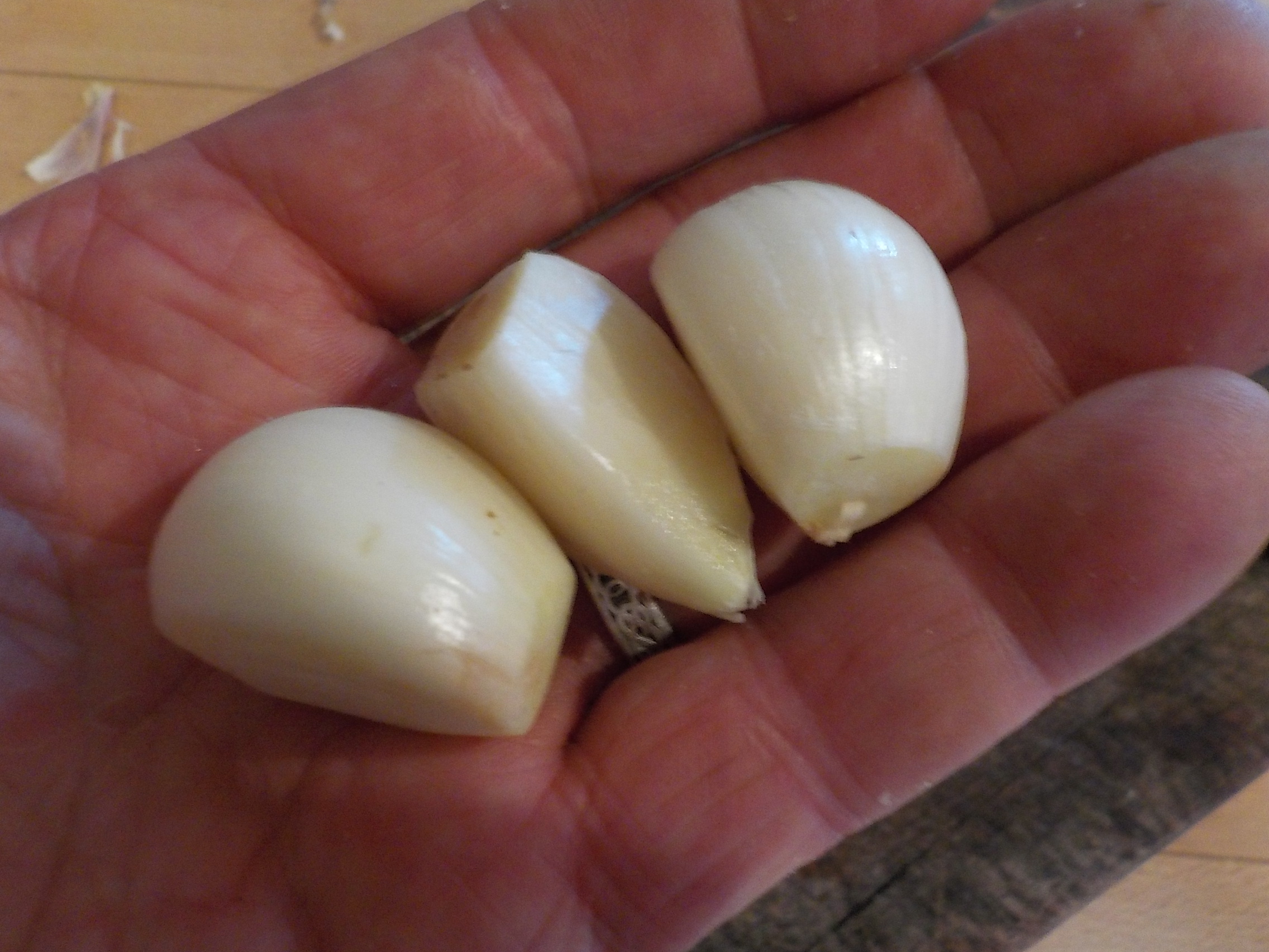 Next prepare the garlic. You can use a lot or a little, depending on your love of raw garlic. I crush 3 large or 6 small cloves of garlic in a garlic press, add to the blender and pulse. I grow my own garlic but you can buy it if you don’t. Hard neck garlic is more flavorful than soft neck – ask for it at a farm stand, as grocery stores don’t tend to sell it.