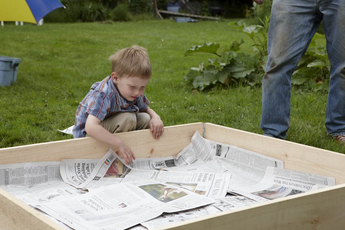 If you choose to place the garden box on the lawn, you don’t need to remove the sod. Just cut the grass as short as you can, then cover it with 6 pages of this newspaper, and fill it up. The soil will kill the lawn. The first year carrots may stop or bend when they hit the bottom of the bed, but after that the soil will loosen up with the action of the microorganisms, and you can grow deep-rooted things without a problem.