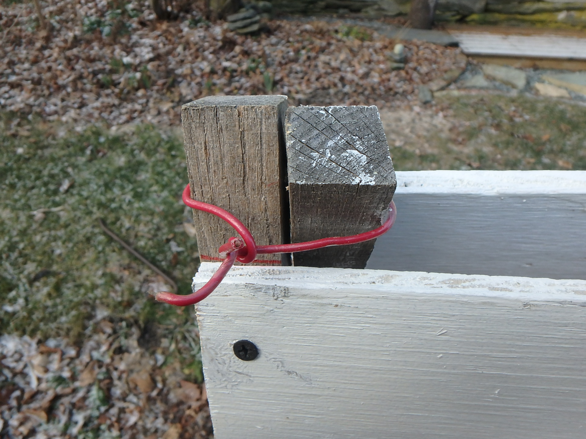 The widest burlap we could buy was 44 inches wide, so my wife Cindy sewed 2 strips together to make an extra wide band. We draped the cloth over the stakes, and stapled the cloth to the stakes – all the way to the ground. We did not cover the top of the shrub, just the sides, so snow will fall through and not weight down the cloth. It worked well last year – the poor deer went hungry.