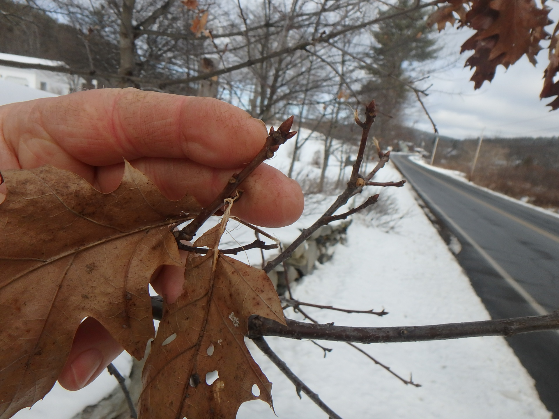 Oak buds have pointed tips and come in clusters at the tips of the branches