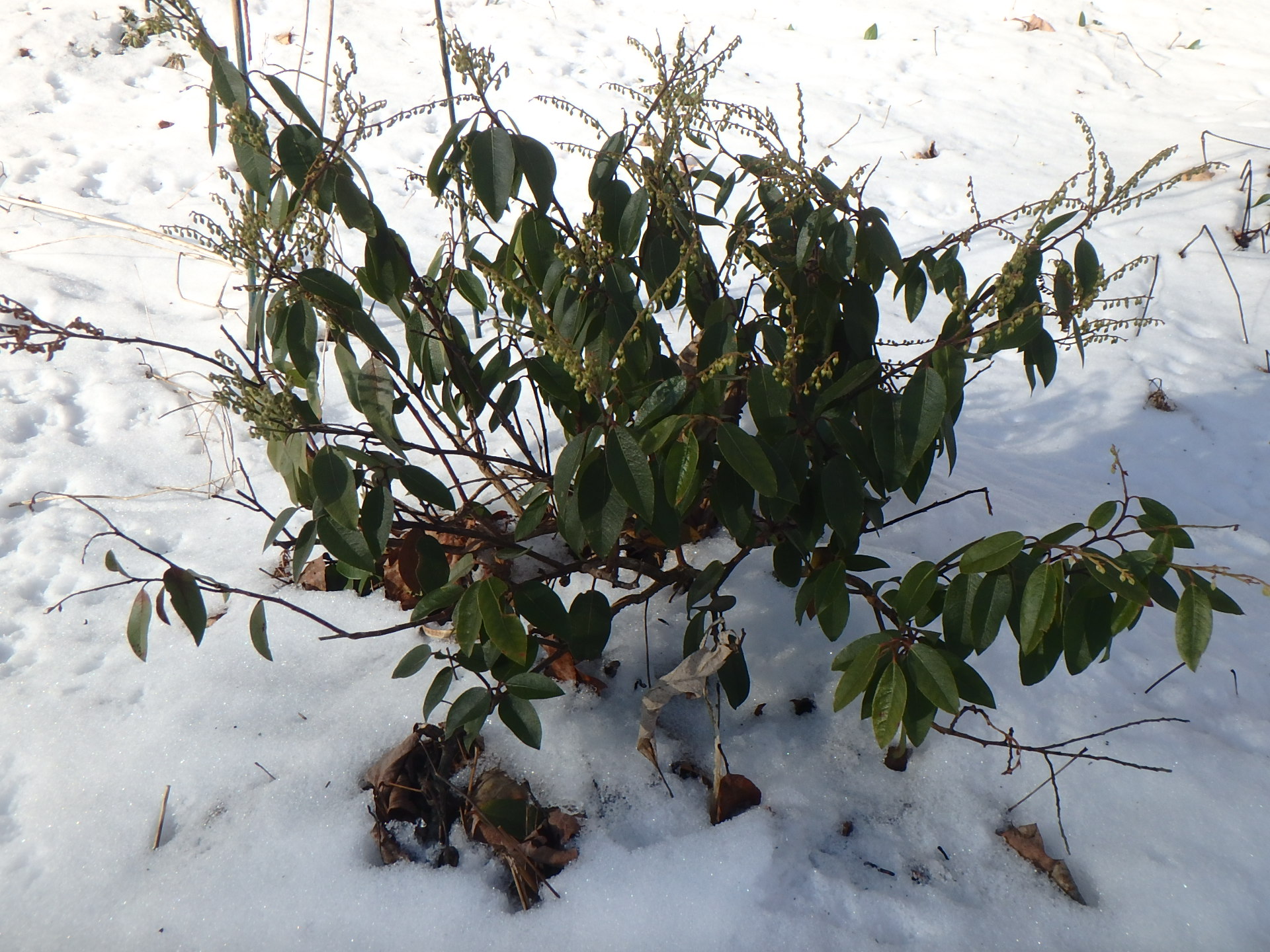For years I have been trying to find the perfect spot for a nice flowering shrub called Carolina allspice or sweetshrub (Calycanthus floridus). I moved it this year for the third time, and finally found a good spot. About ten years ago I planted it in full sun with moist soil, and the leaves burned. Then I put it in shade, and it didn’t flower much. This year I moved it to a drier location in dappled shade under a pear tree. It grew well, and appears to have settled in well.