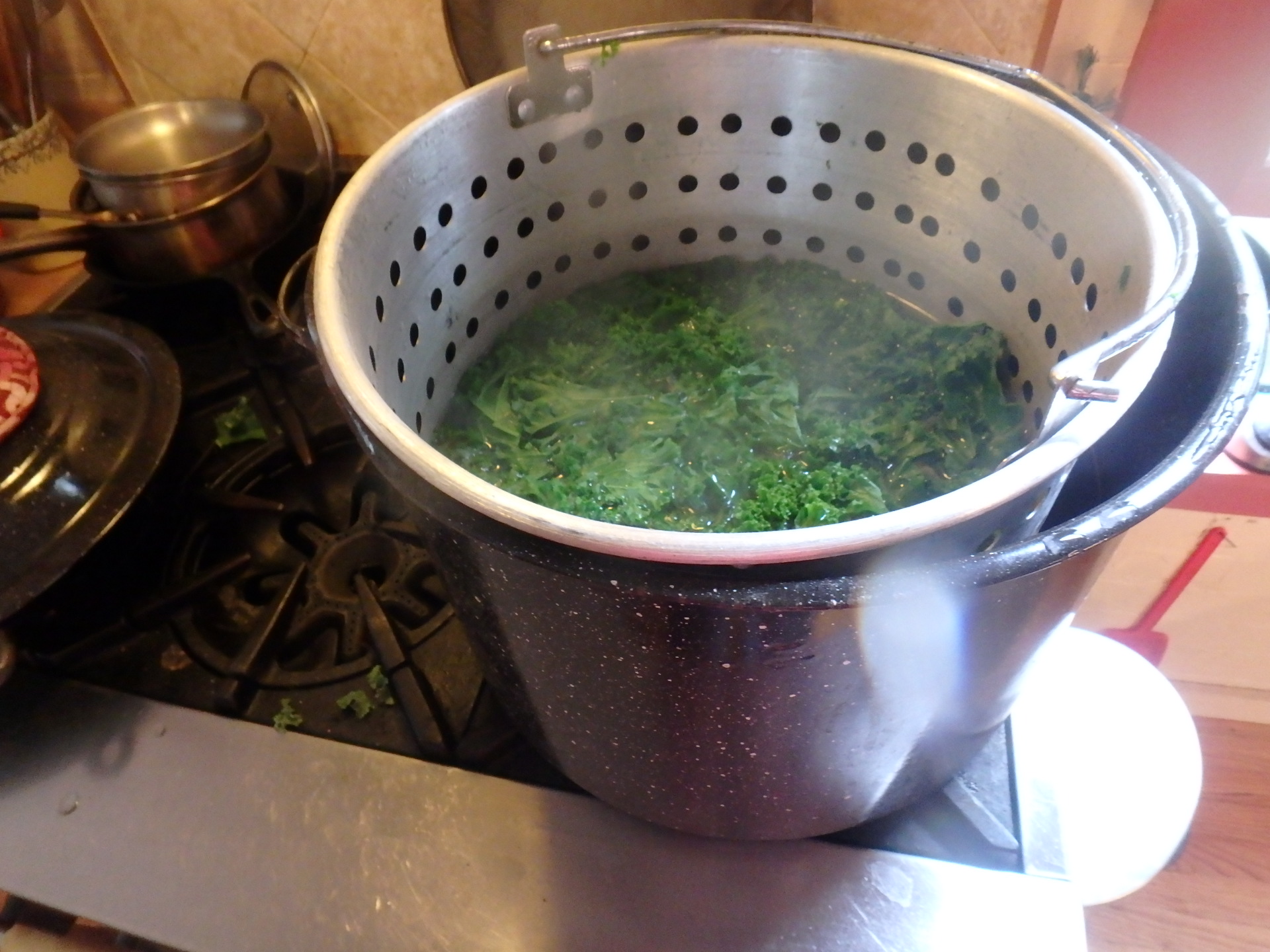 For the blanching of kale and other veggies, I use my big black tin pot that is sold for hot water bath canning – it is roughly 14 inches wide and 9 inches deep, and will hold 7 quart mason jars for canning tomatoes. I fill the canner half full, and bring to a full, rolling boil.