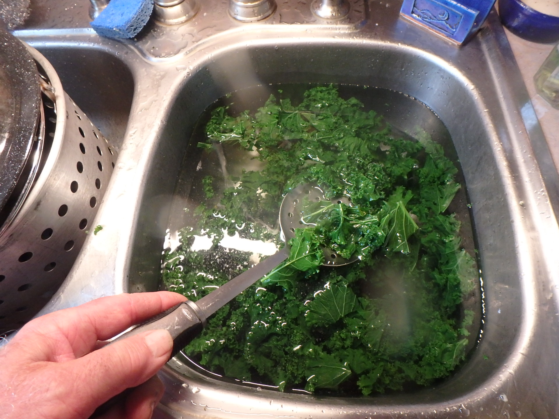 To freeze kale I wash it first and make sure it is free of (Ugh) slugs and bugs. Then I either pull the leaves off the midrib, or slice it off. I chop the kale into 1-or 2-inch squares, prior to blanching in boiling water.