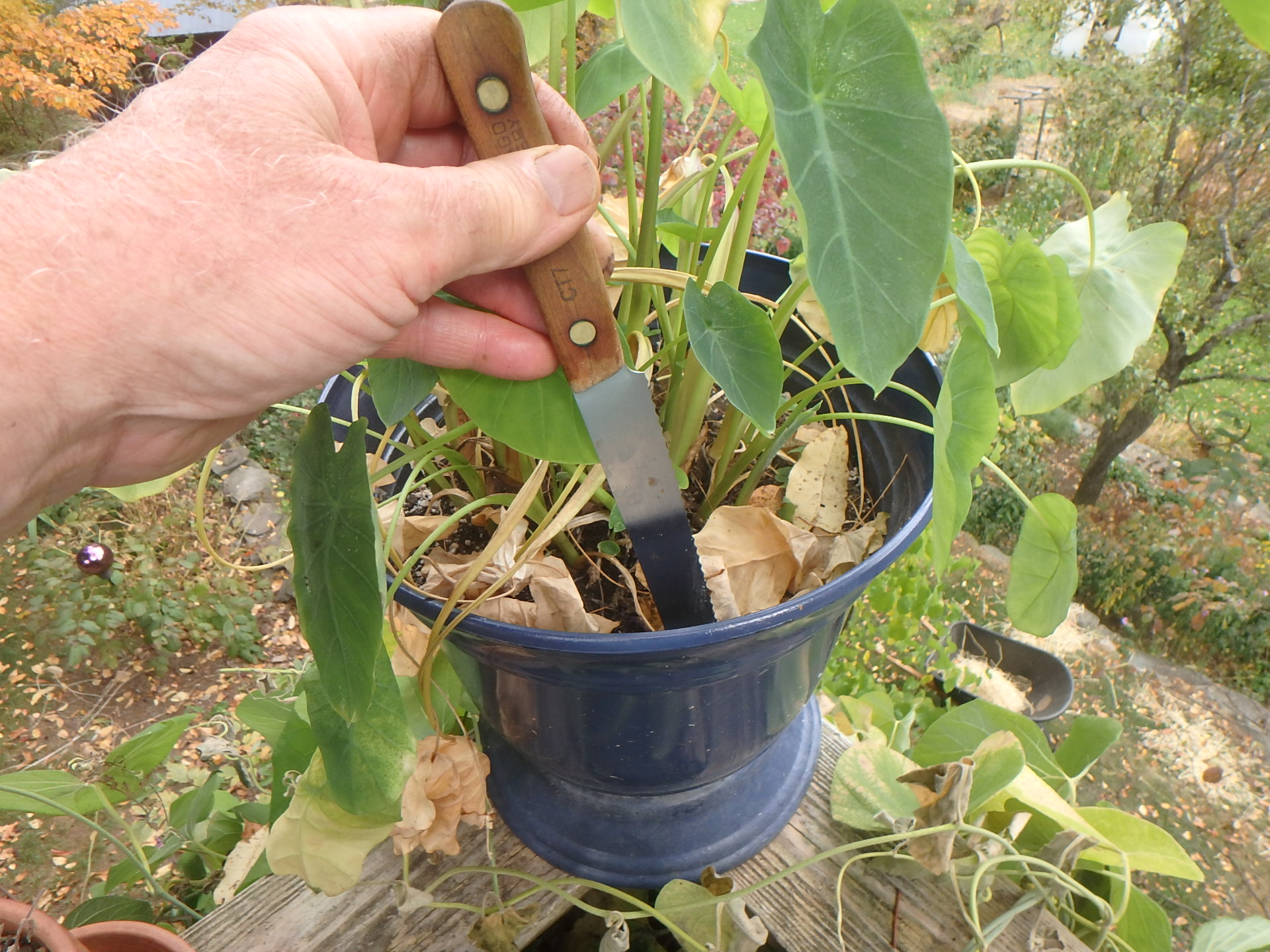Getting a plant out of a pot is not always easy. If the pot is small enough, hold it upside down, give a tug on the plant and it will slide out into your waiting hand. For bigger pots I use a long bread knife or cake spatula and slide it between the root ball and the pot, poking and pushing all the way around the outer edge to loosen the soil. Then I turn it upside down again and try to remove it.