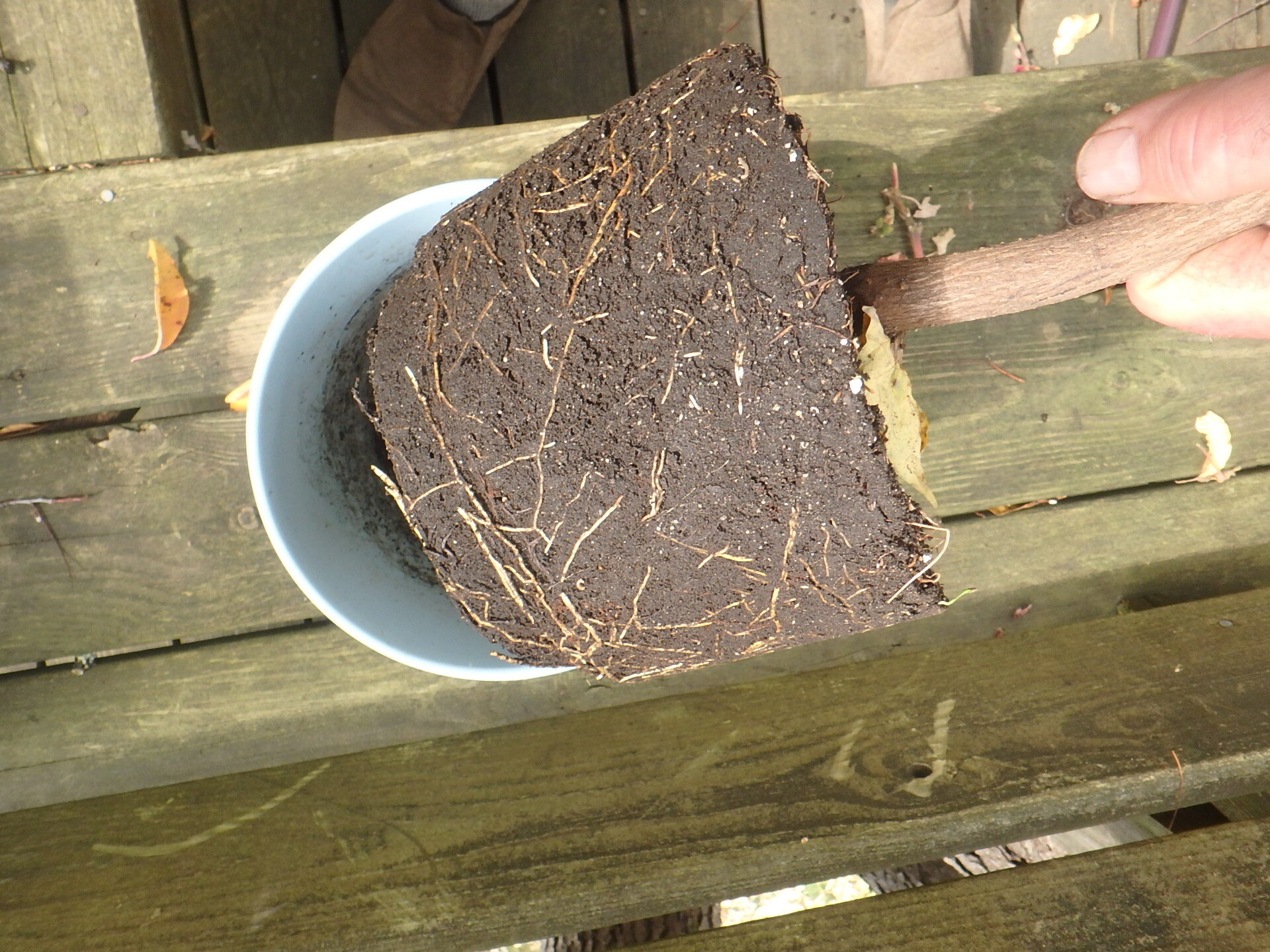 I like to have an inch of two of my freshly made potting mix in the bottom of the pot, and half an inch to an inch of it all around the perimeter. To make space around the outside requires removing old soil – or using a slightly bigger pot