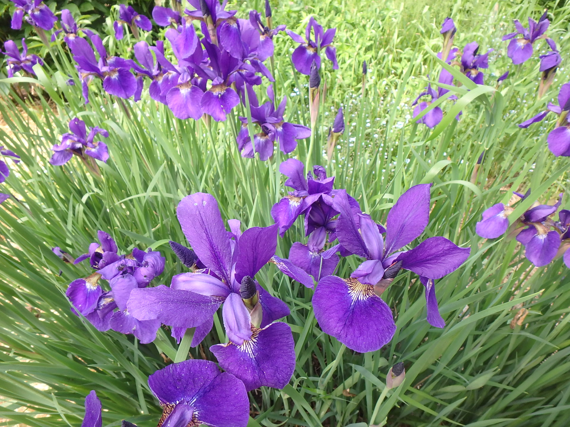 Siberian iris only bloom for a few days, but are magnificent. They come in a variety of blues and purples. Old patches tend to develop a dead spot in the middle because the plants have used up all the soil nutrients. Divide in the fall and re-plant, or add some organic fertilizer now.