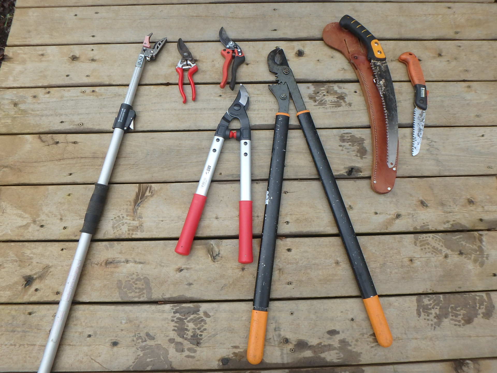 First, you need good sharp tools: hand pruners, a pair of loppers, and a pruning saw. A pole pruner is also helpful, and you may want to use a 4- or 5-foot stepladder. Don’t buy cheap tools: they will not do a good job for long. Buy the best you can afford, and take good care of them. Pruners and loppers can be sharpened with a simple and inexpensive diamond-studded sharpener, but most pruning saws are not suitable for sharpening.
