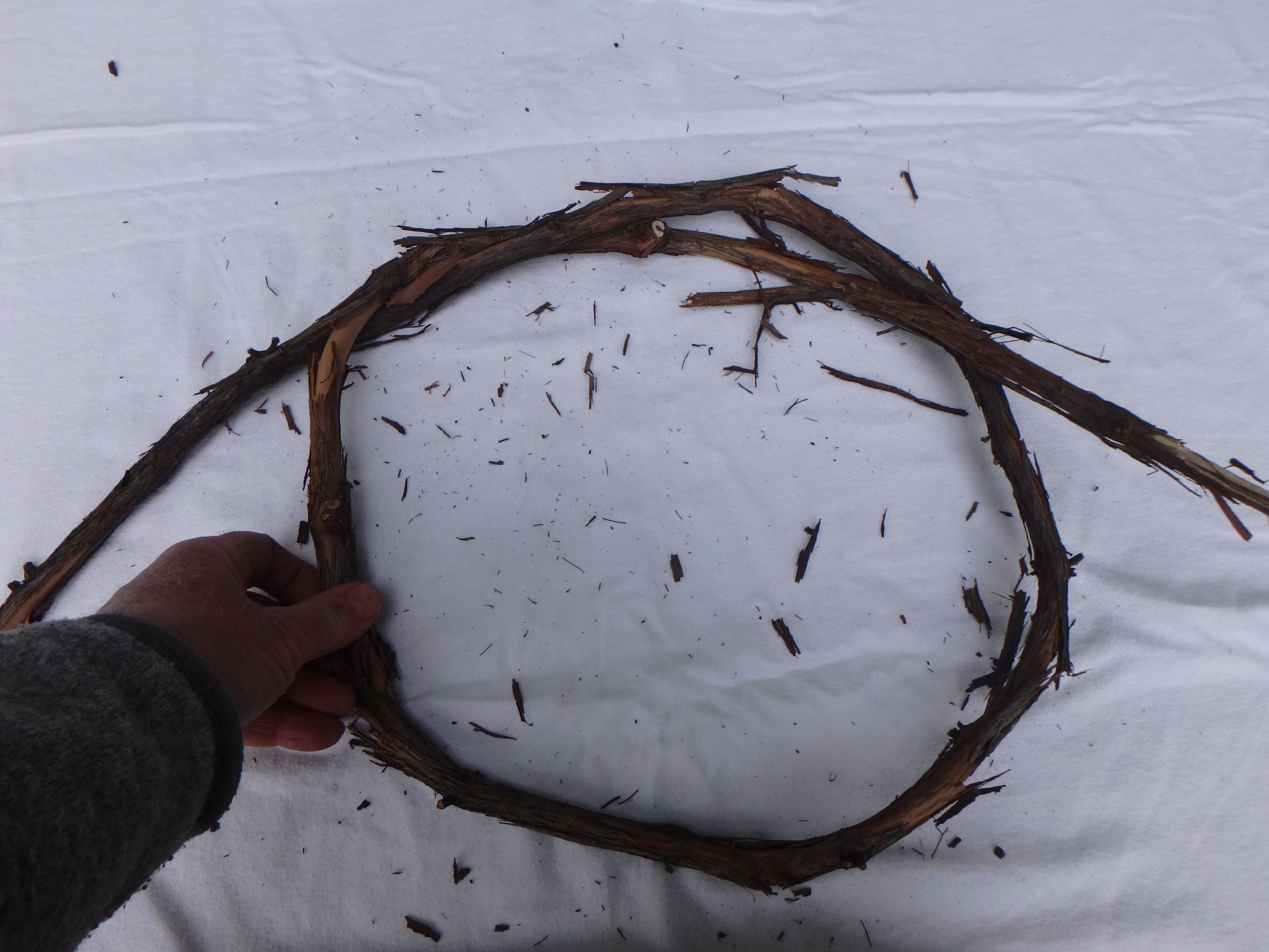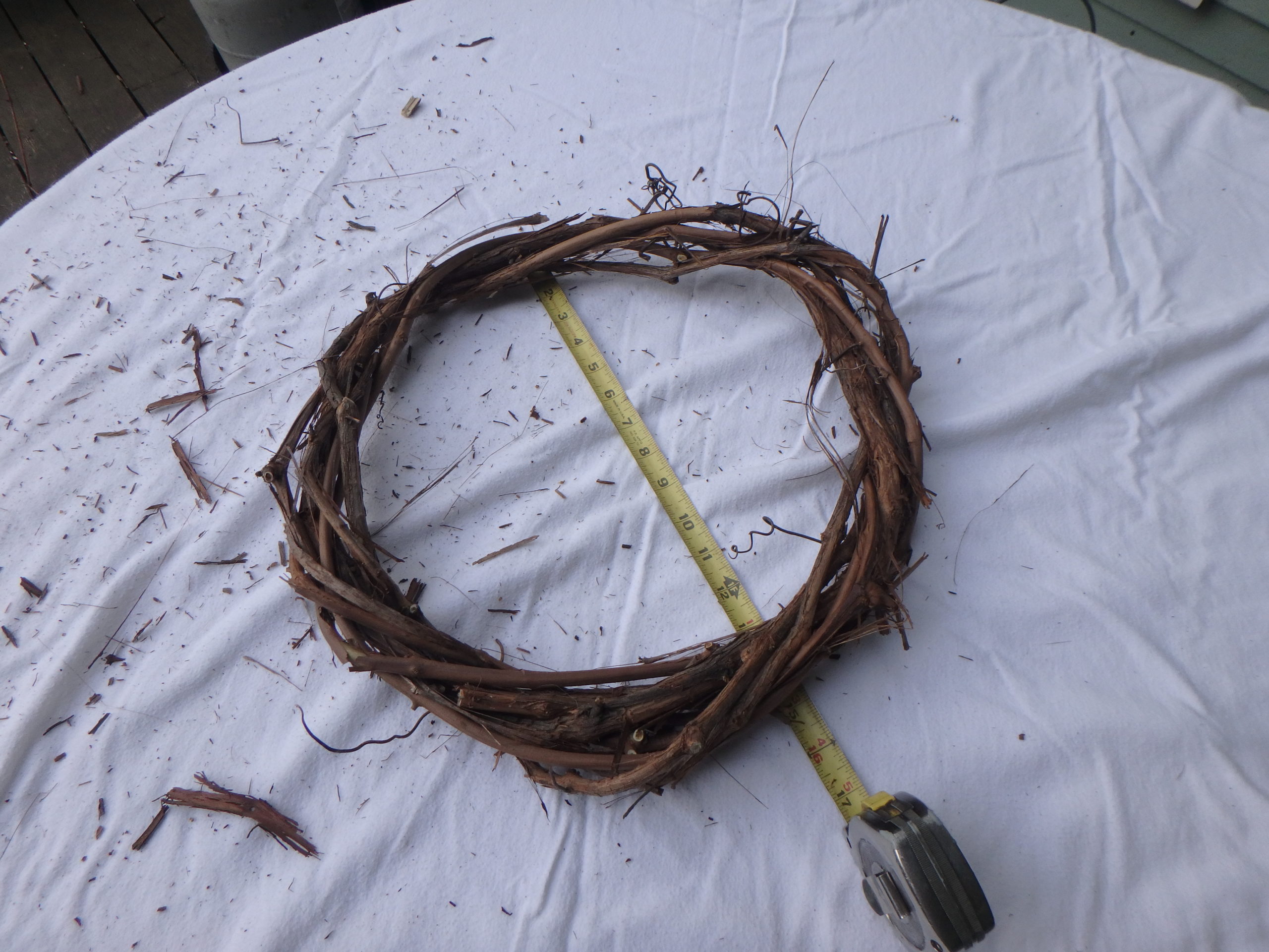 Begin by forming a vine circle 14 to 16 inches in diameter by overlapping (or twisting) one half of the vine over the other half – the same way you would start tying your shoelaces. Then grasp one of the sections of vine and weave it around the vine circle in loops, over and under, pulling it tight as you go. After each piece of vine is in place, squeeze the circle to make it a nice circle.