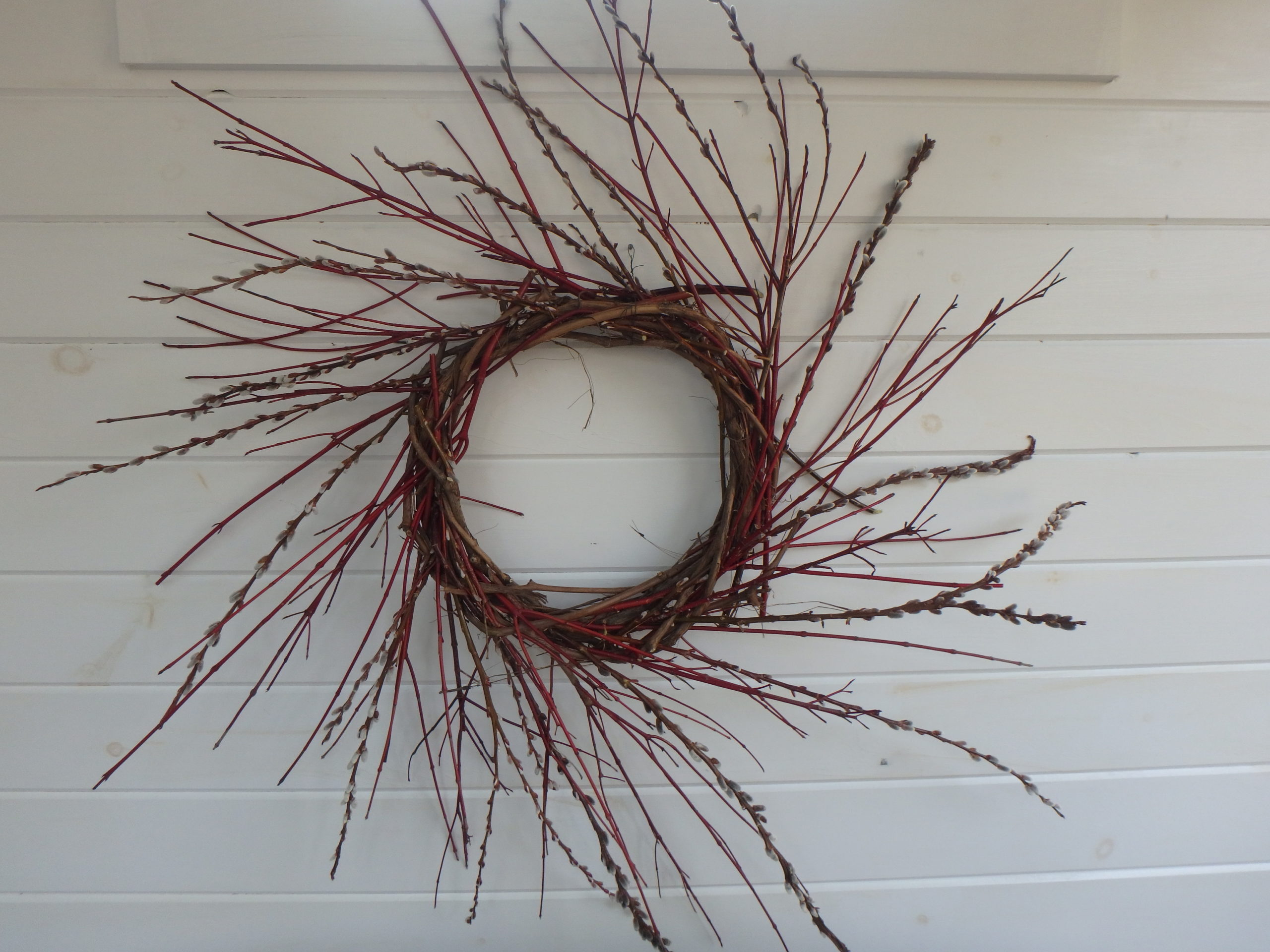 Then I added stems of pussywillow, poking them into open spaces in the grapevines, or using a screwdriver to open a space for my stems. When it was nearly done I hung the wreath up where I could work on it and was better able to see where there were gaps that needed twigs, and added a few more.