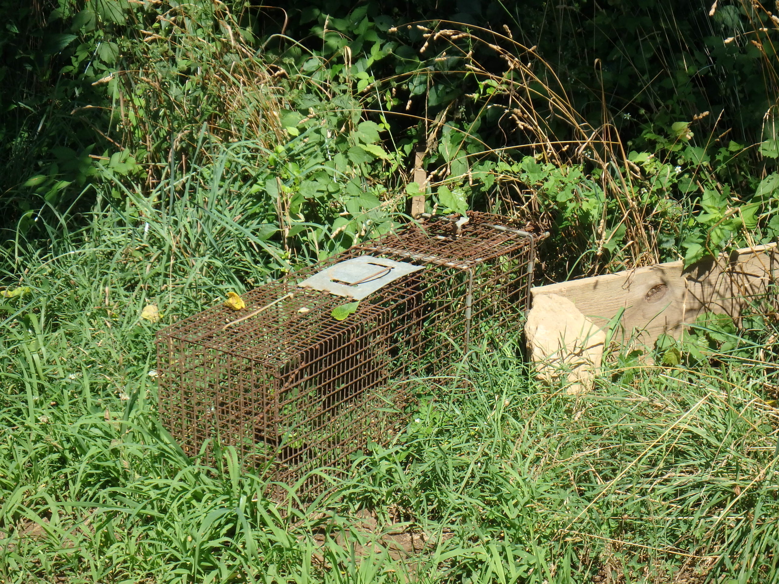 Woodchucks can do a lot of damage but Glenn has figured out how to trap them. He places a large Hav-a-Hart near a woodchuck’s hole and uses 2 wide boards about 5 feet long and 10 inches wide to create a V-shaped chute leading to the open mouth of the trap. He doesn’t bother with bait. He said that they don’t see well, but will approach the trap and enter it as a way to proceed to the field. Clunk. The cage closes.