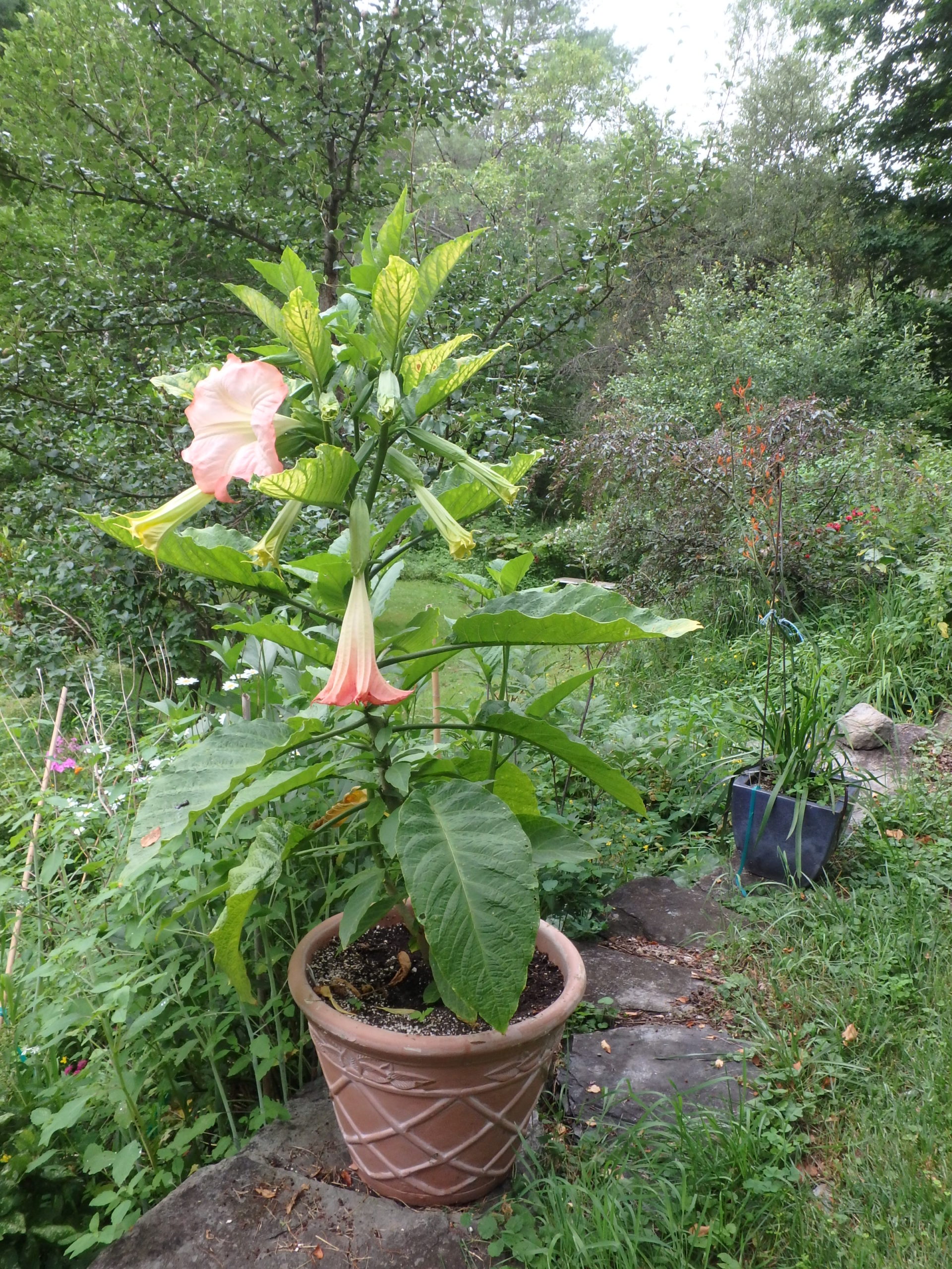 This year Cindy splurged and bought a Brugmansia, a large tropical plant that we hope to winter-over in a large pot indoors. It has been displaying an amazing sequence of 12-inch bell-shaped blossoms in a delicate peach color. Other varieties have yellow blossoms. Some varieties of Brugmansia are deliciously fragrant, but ours is not. The plant is in a 20-inch pot and stands 4-feet tall with a main stem, and now two shorter stems. The stems will become woody with time. It is in full sun and needs a drink at sundown after each hot day.