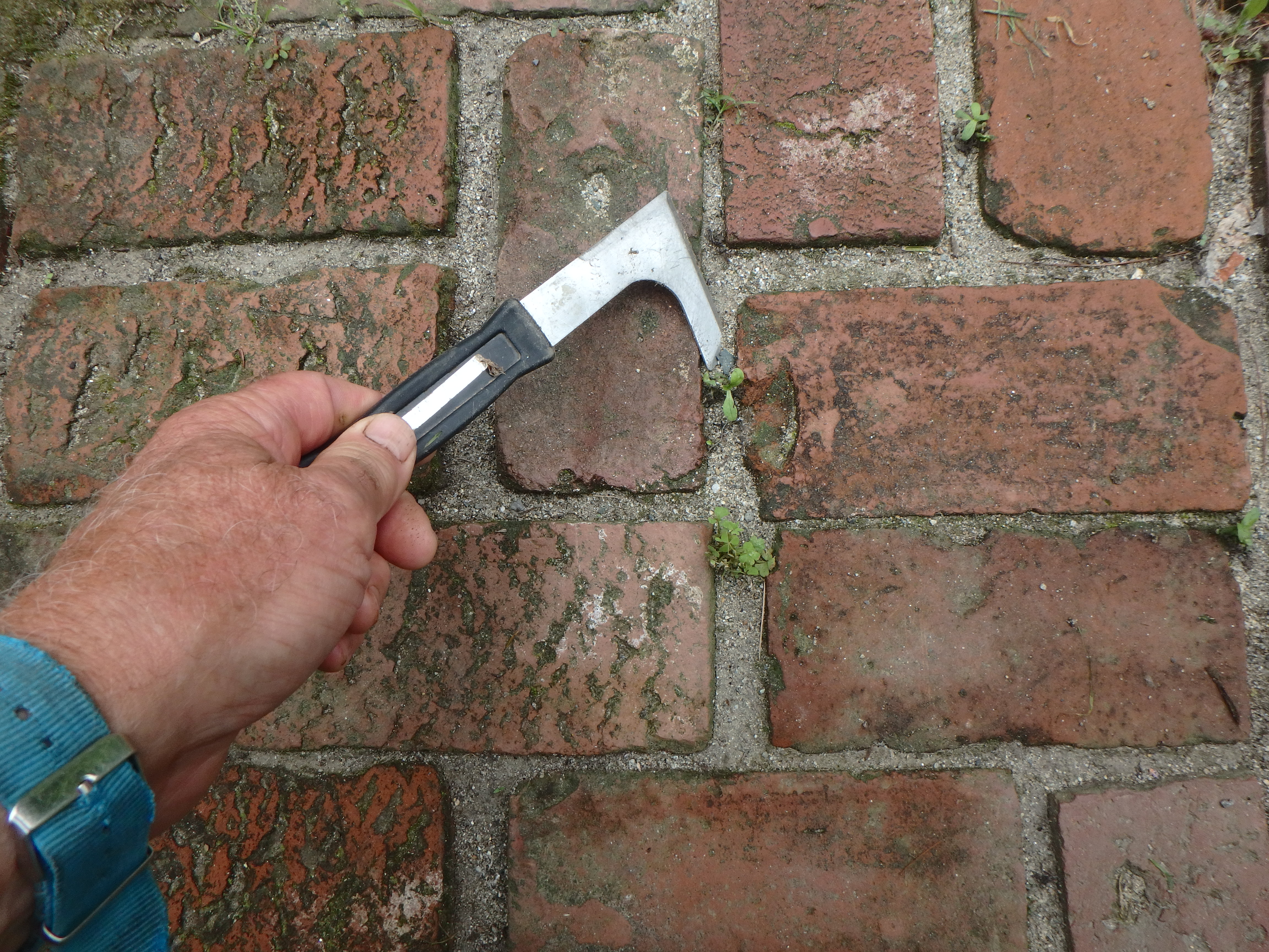 I don’t use chemicals, so instead of spraying I use a “patio weeder” to get between bricks. It is an L-shaped tool, thin and flat. It’s great for getting between bricks and generally very inexpensive.