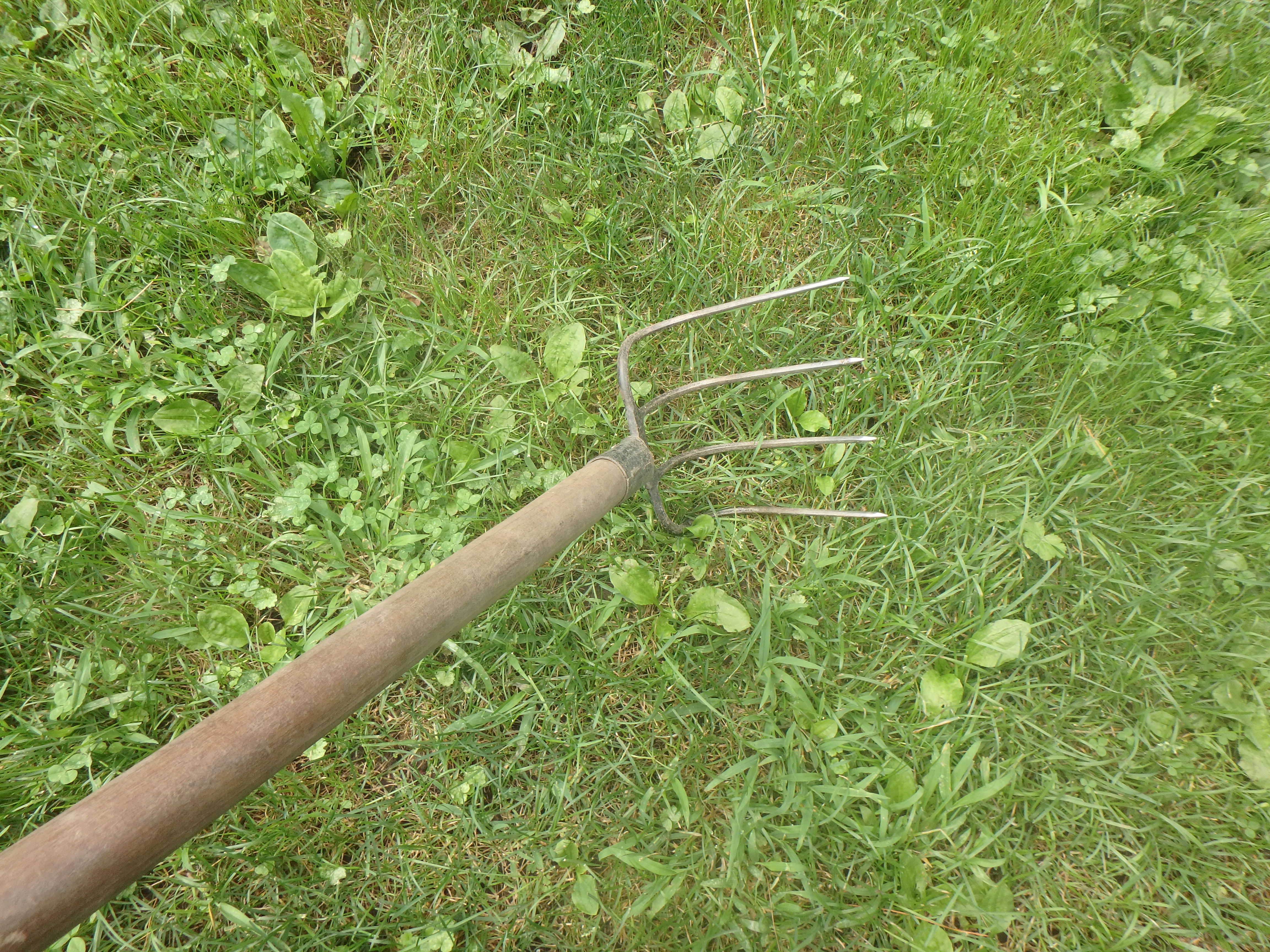 It’s important to be careful when digging potatoes so that you don’t damage any. I use a potato fork that has been in my family for decades. It’s like an ordinary garden fork, but the tines are at a right angle to the long handle, and are sharp and long. To harvest I pull the soil to one side with the potato rake. Then I plunge my fingers into the loose soil to find the spuds. If I spear a potato it goes into a pile destined for immediate consumption.