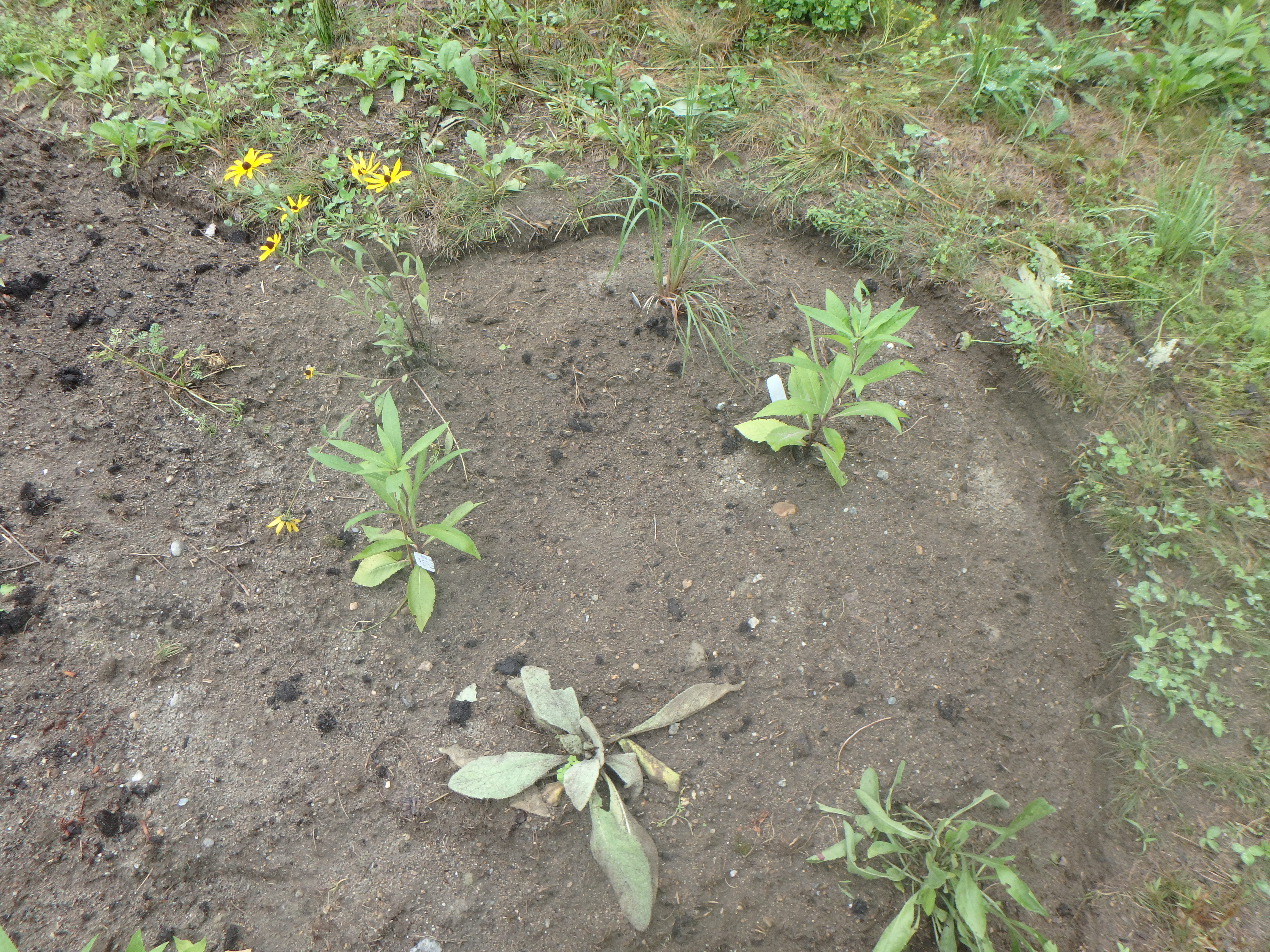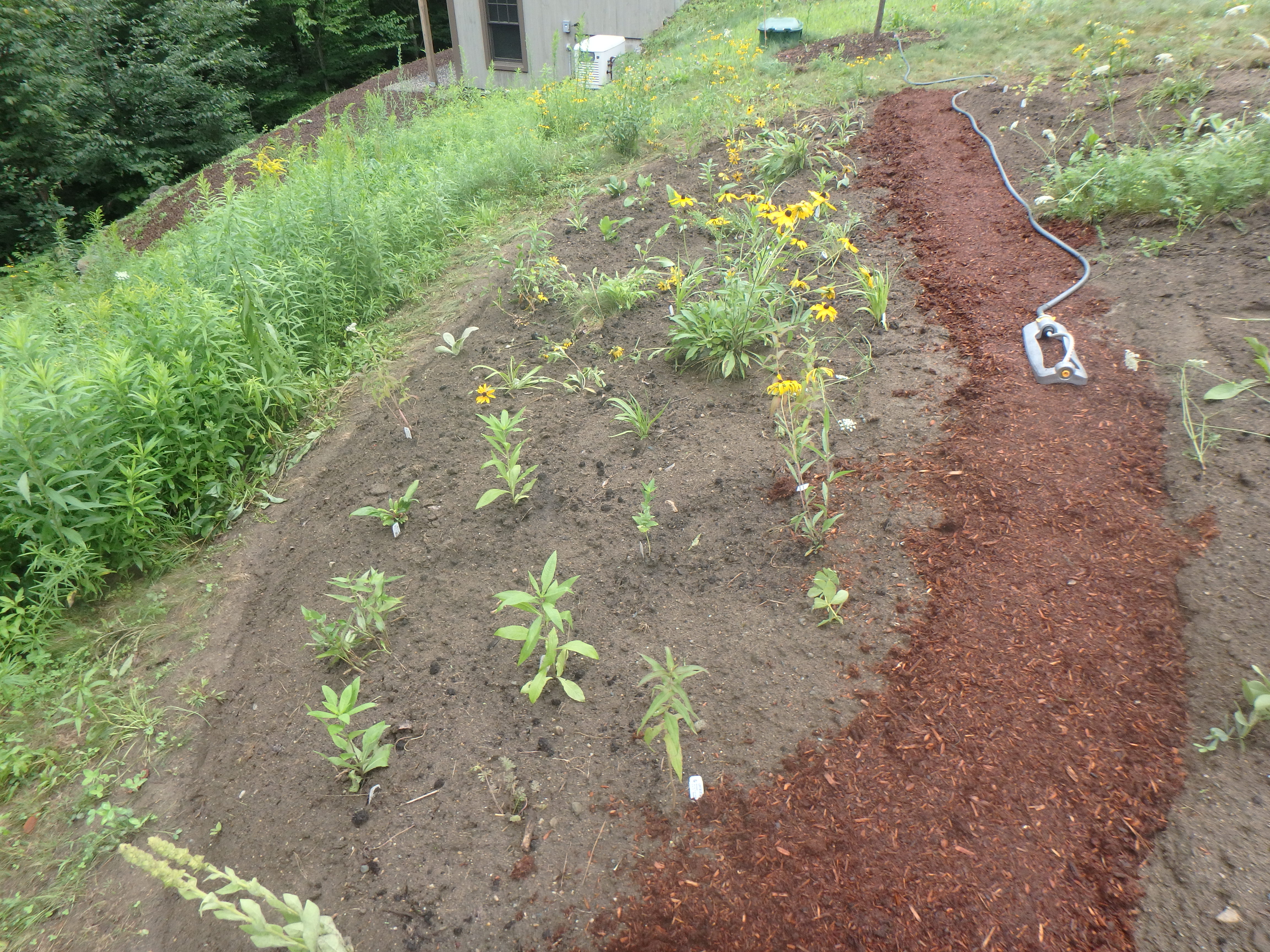 Then came the fun part: planting. I spoke recently with Jane Sorensen of Northeast Pollinator Plants and River Berry Farm. Jane is co-owner of NEPP and a professor at UVM. According to Jane, it is important to resist the temptation to add compost, manure and especially fertilizer, even if the soil is very lean – devoid of the dark organic material that our veggies and cultivated flowers are given for best results. The wildflowers in our selection from NEPP do well in poor soil and get too tall and flop if given fertilizer or much compost.