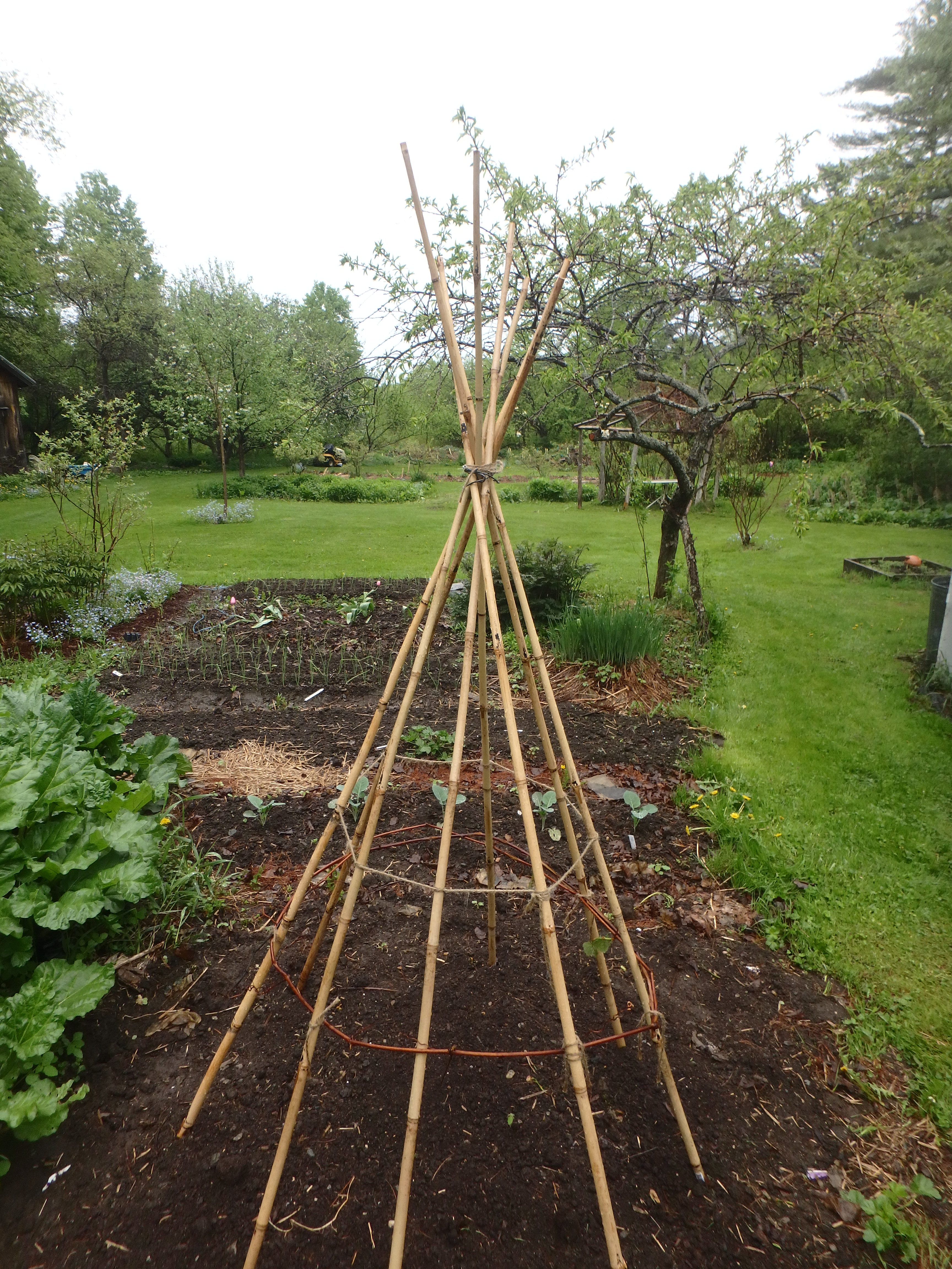 This project would be easier with 2 people working together, but I was alone in the garden and got the teepee made. I used a 2-foot length of thin copper wire to wrap around the place where all the poles crossed near the top of the teepee. String would also work fine.