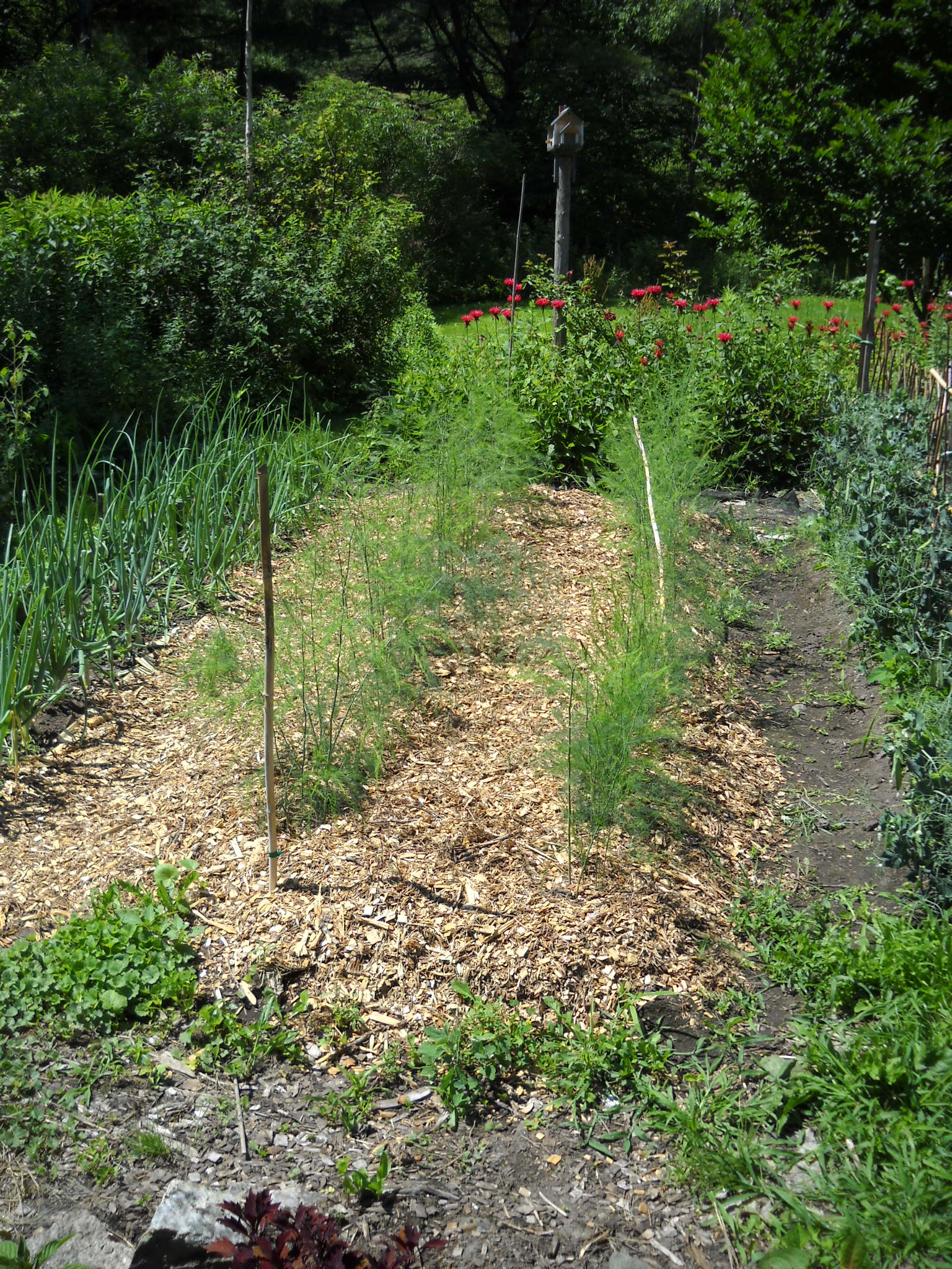 This method works well on walkways and around big plants, but is more problematical for onions and carrots which are small and closer together. I use grass clippings or chopped leaves, without the newspaper, around small plants.