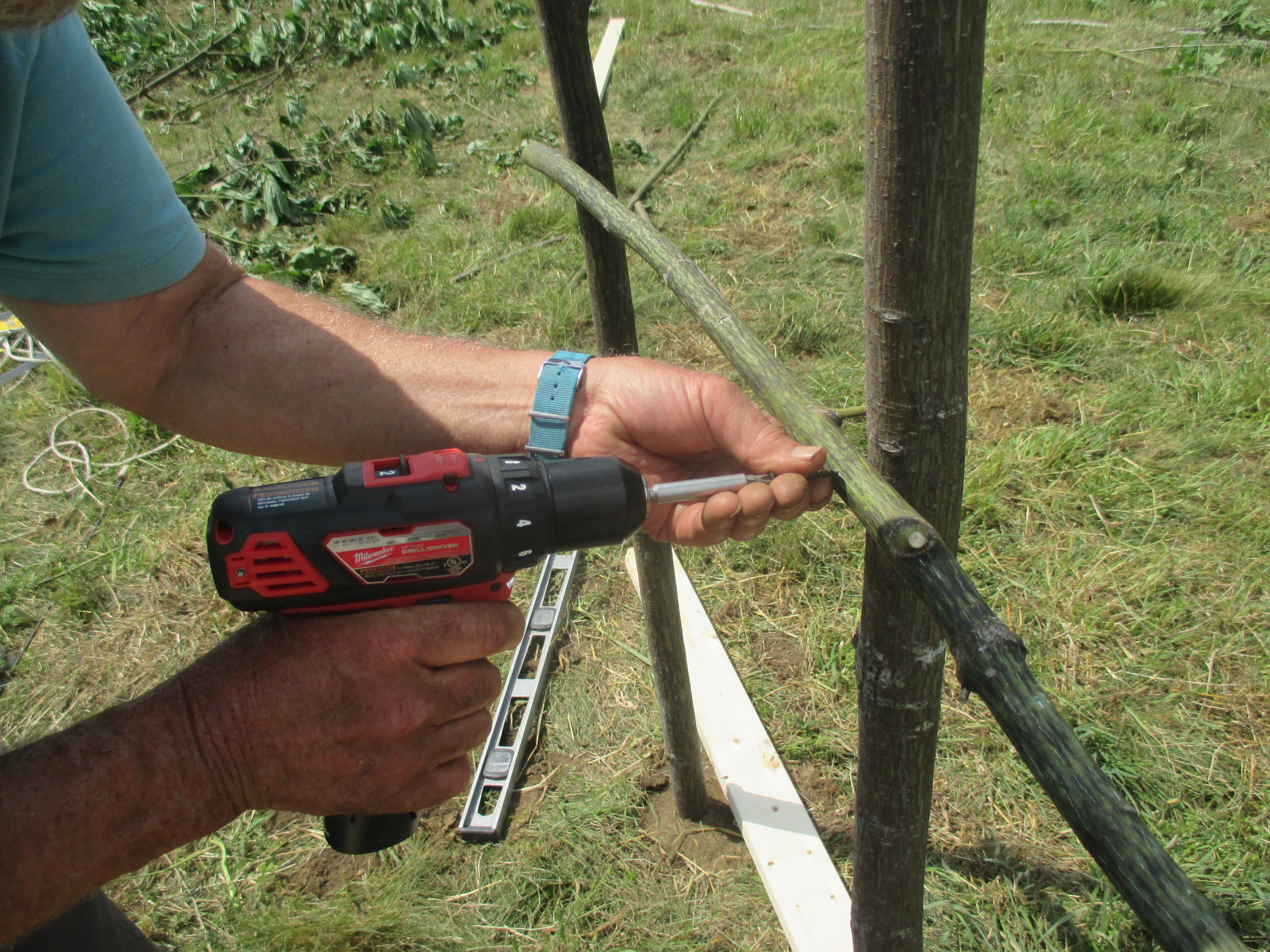 Tip # 3: You are not building a violin. It is easy to get obsessed with making every post absolutely vertical, and every horizontal precisely level. But, especially for arbors made of saplings, each piece is slightly different. Some have little curves, others have lumps and bumps. Work with a helper so one of you can adjust your posts to look good – standing straight up, with roughly level cross pieces. So long as it looks good to your eye, it is fine.