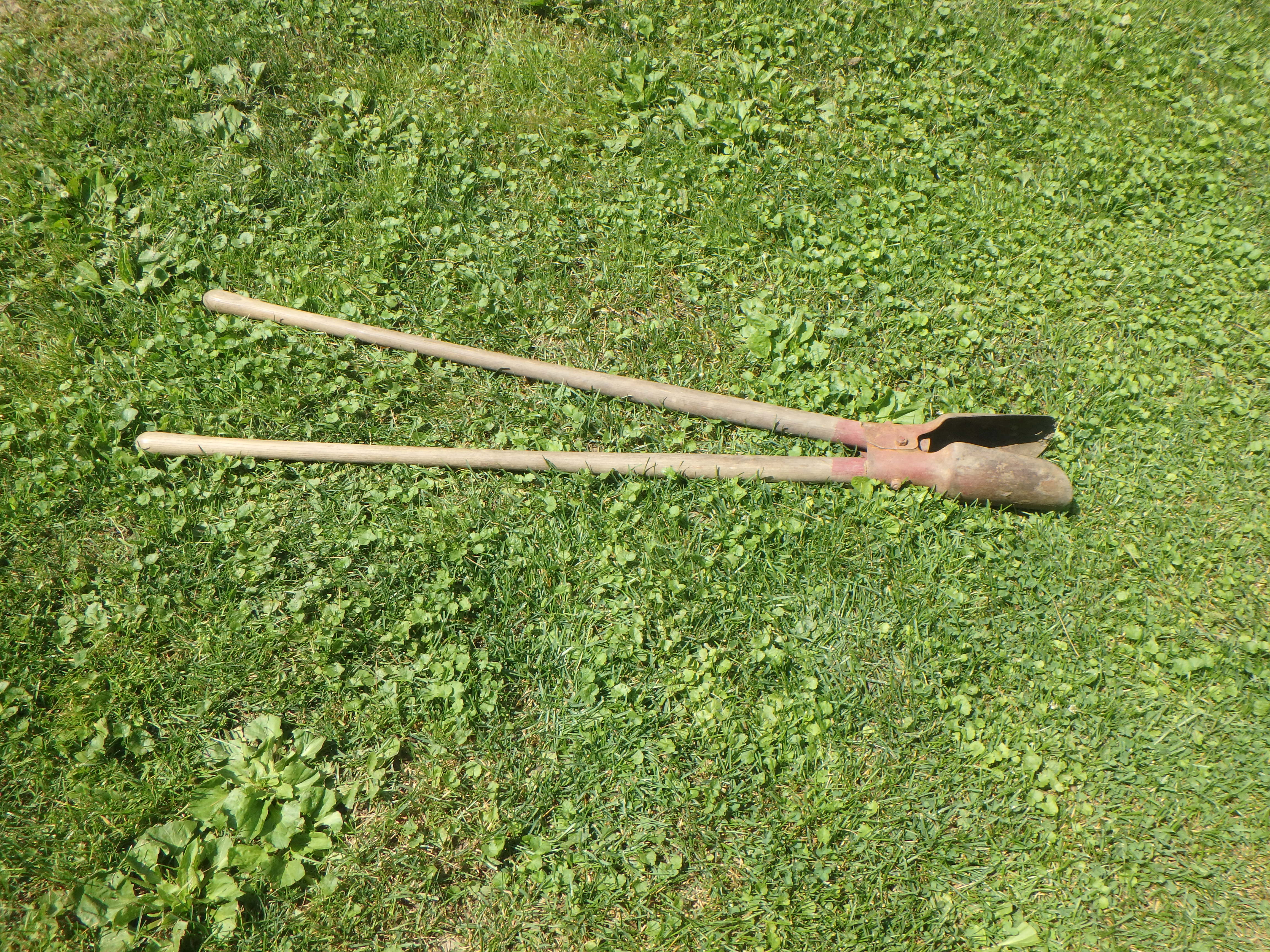 Tip #2: Get a post hole digger. This is a dandy 2-handed device that allows you to scoop out soil relatively easily. It makes a 6- or 8-inch diameter hole, which you could not do with a shovel. Dig holes a foot deep to give a nice sturdy feel to your arbor. I put a few small stones (the size of golf balls) in each hole alongside the posts and jam them in with a hand tool.