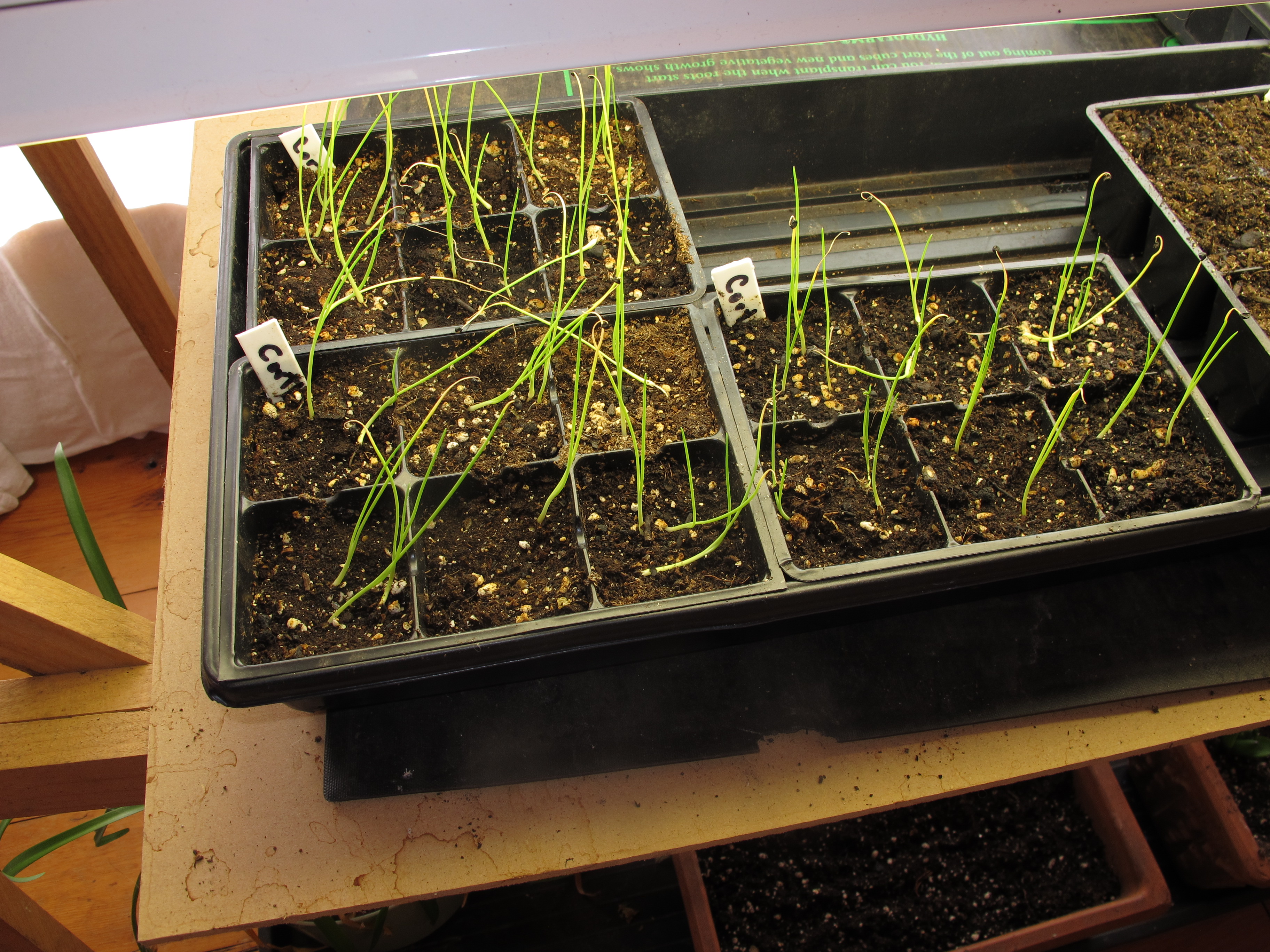 Meanwhile, indoors, I have 5 flats of seedlings growing under lights. These require daily attention, though not much. I water, and I pluck out or snip off extra seedlings that grow. I want just one tomato plant per cell, for example, though I always plant 2 per cell just to be sure that I get one to grow. It’s hard to kill a cute little tomato plant, but I know that the survivor will do better if it’s not competing for water and nutrients.