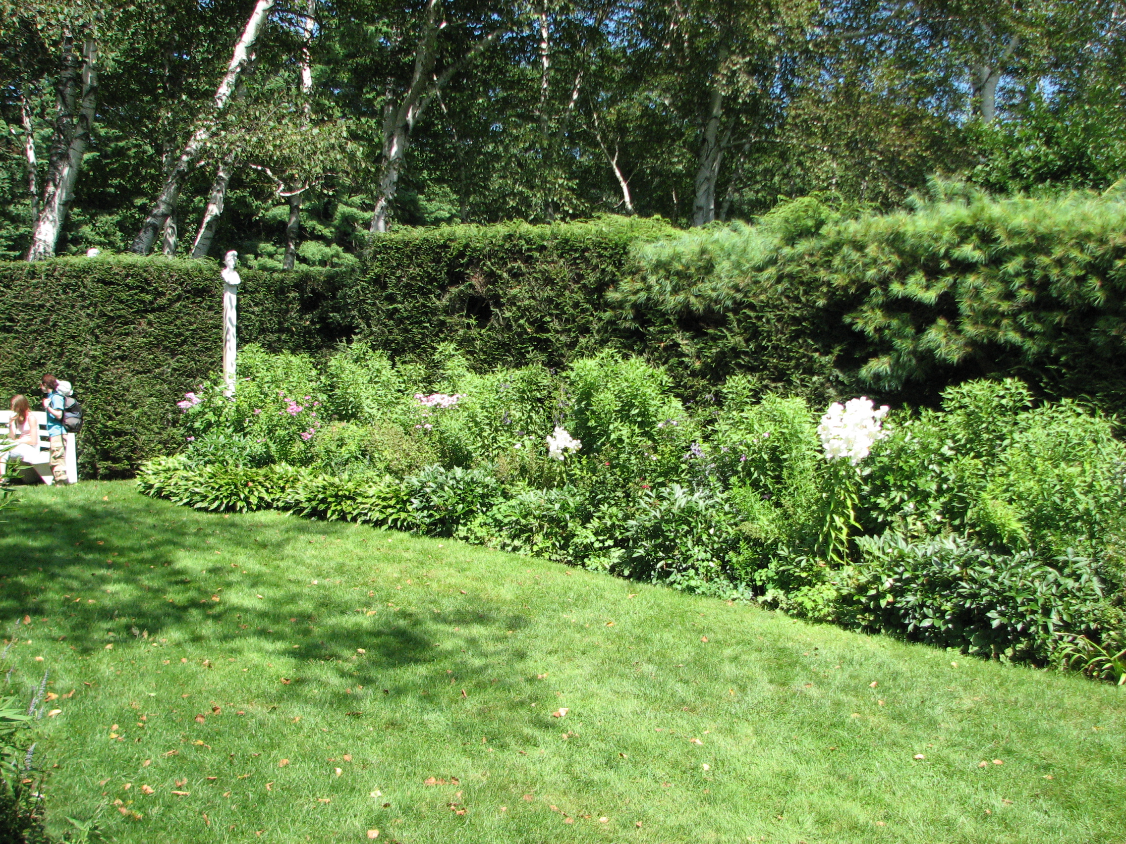 In addition to the usual hedge plants, edible hedges can be made using gooseberries, currants or blueberries. Decorative grasses can be used, or even golden rod (if you dare risk the scorn of your neighbors). I once divided and moved several large peonies for a client who was re-doing a garden. I divided them into 50 plants and spaced them so that, when mature, the foliage would mingle and create a single row of plants. By now it must be drop-dead gorgeous in June. It’s not a hedge that provides privacy, but it is wonderful in bloom and it sets off their lawn from the neighbor’s lawn.