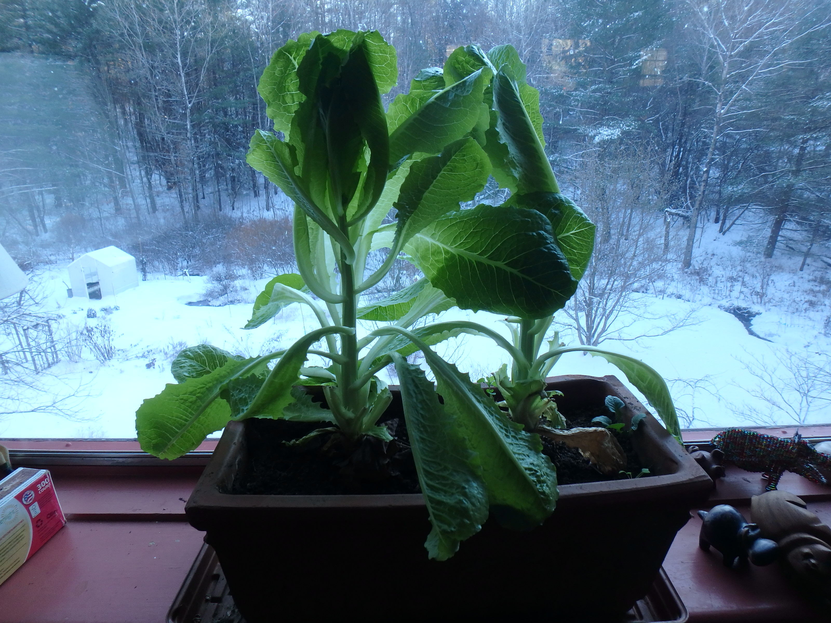 New this year: In mid-October I dug two nice lettuce plants and moved them into an unglazed clay planter about 6- by 12-inches and 6-inches deep. I placed a layer of fluffy compost in the bottom as planting material, and filled in around the plants with pure compost. Then I moved them into the house, sitting in an east-facing window. Great success! I have eaten 2 or 3 leaves almost every day since sometime in November. Fresh greens for my sandwich at lunch. I had to water every other day. I will finish them off by New Years.