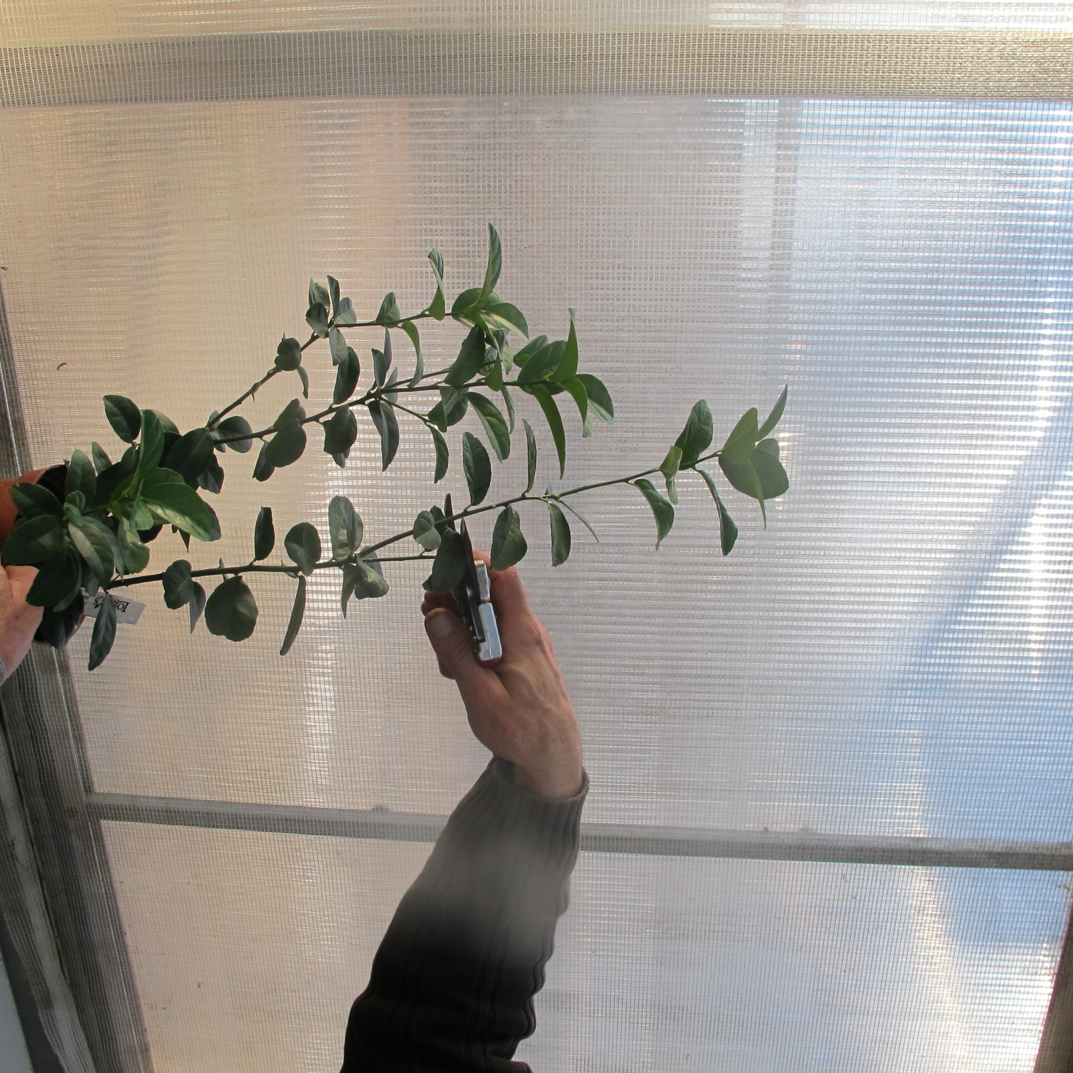 Then I got a Meyer Lemon. With proper pruning it will produce fruit when just three feet tall and is on the “Best Bets for Beginners” list. Like the lime, this plant will go outside in full sun for the summer, and can tolerate temperatures down to 50 degrees. At Logee’s, most of their lemons grow in 12-inch baskets high in the greenhouse as they love heat. Each of those plants produces about 30 lemons a year!