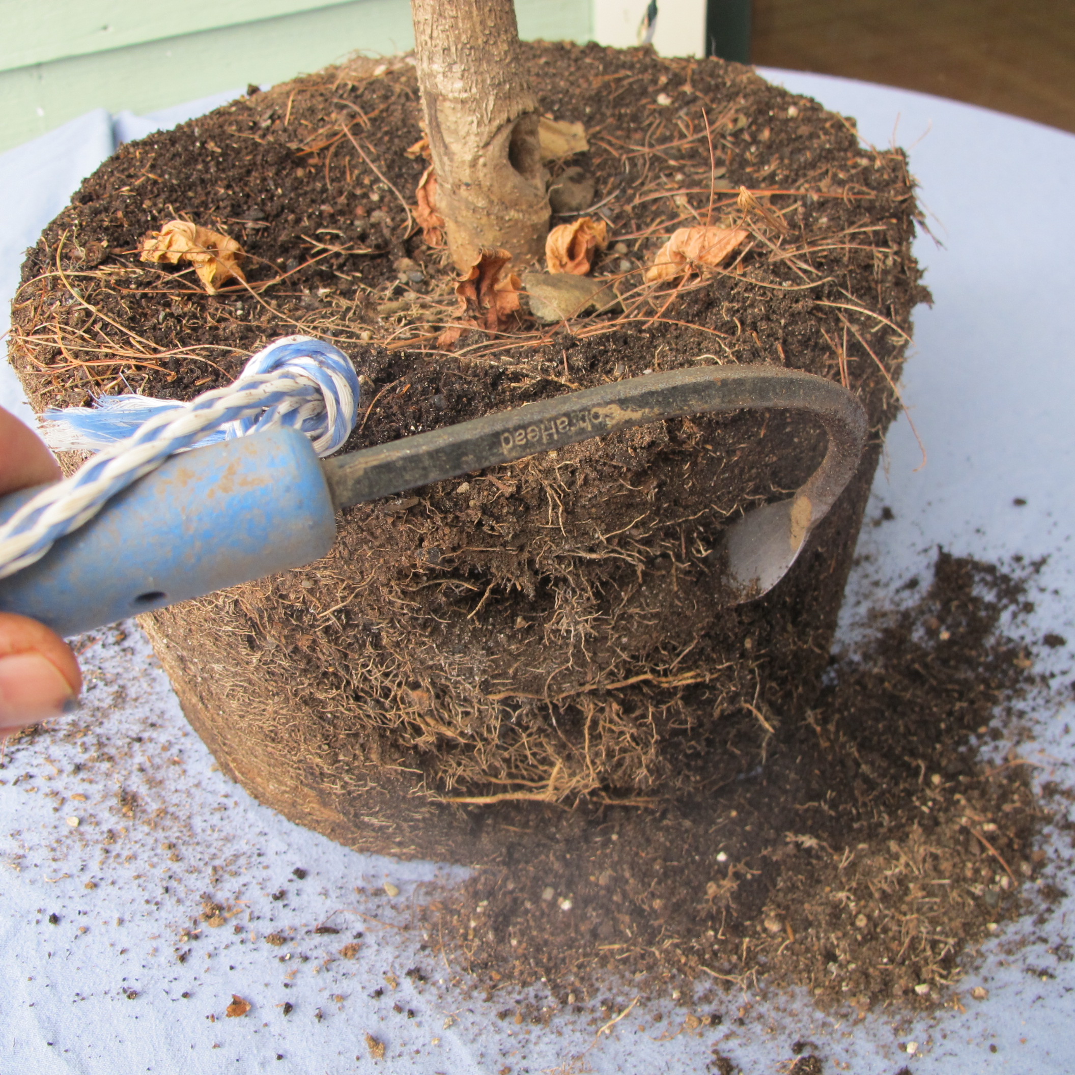 After teasing out the roots I placed the root ball back into the pot and filled the space around the edges with my soil mix. I used my fingers and a piece of kindling – a wedge-shaped board that could get almost to the bottom of the pot – to push the mix down the sides of the pot.