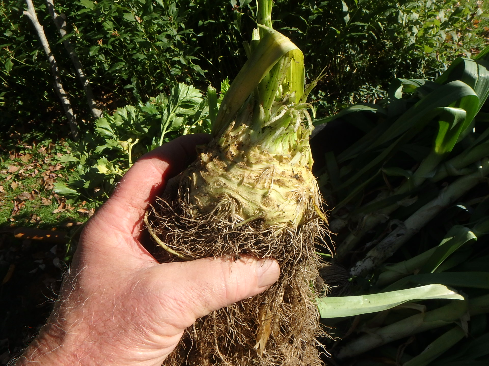 Cut away the fine roots of celeriac to expose the bulbous root used for cooking or salads
