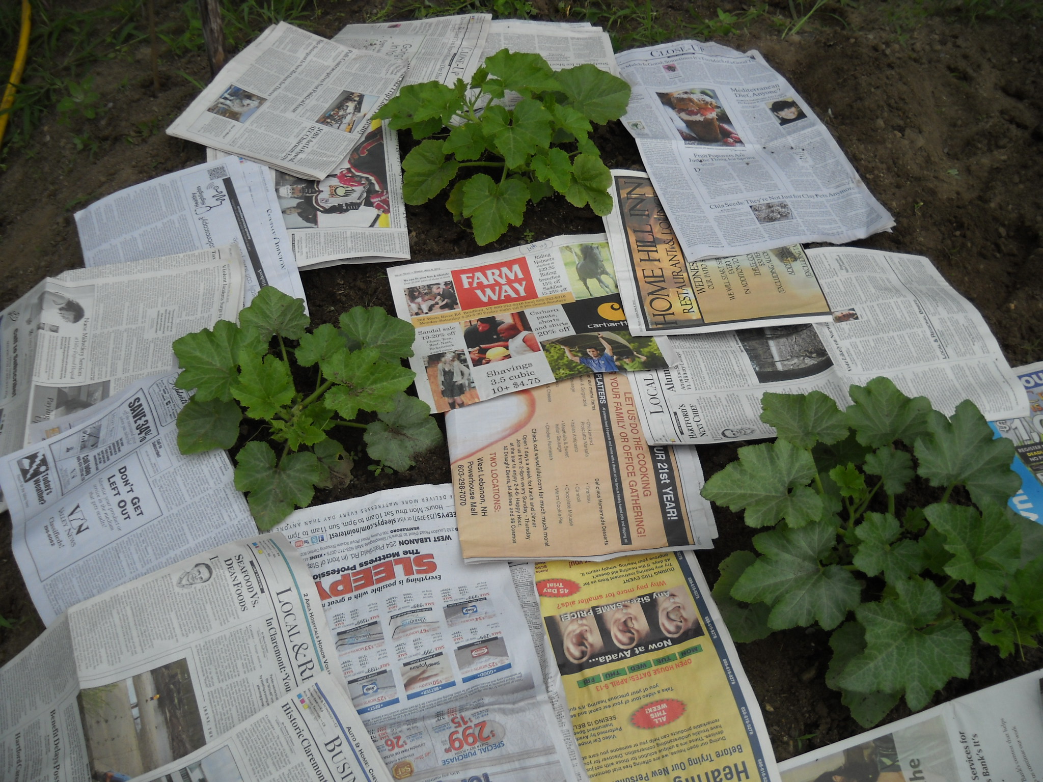 This method works well on walkways and around big plants in the vegetable garden, but is more problematical for onions and carrots which are small and closer together. I use grass clippings or chopped leaves, without the newspaper, around small plants.