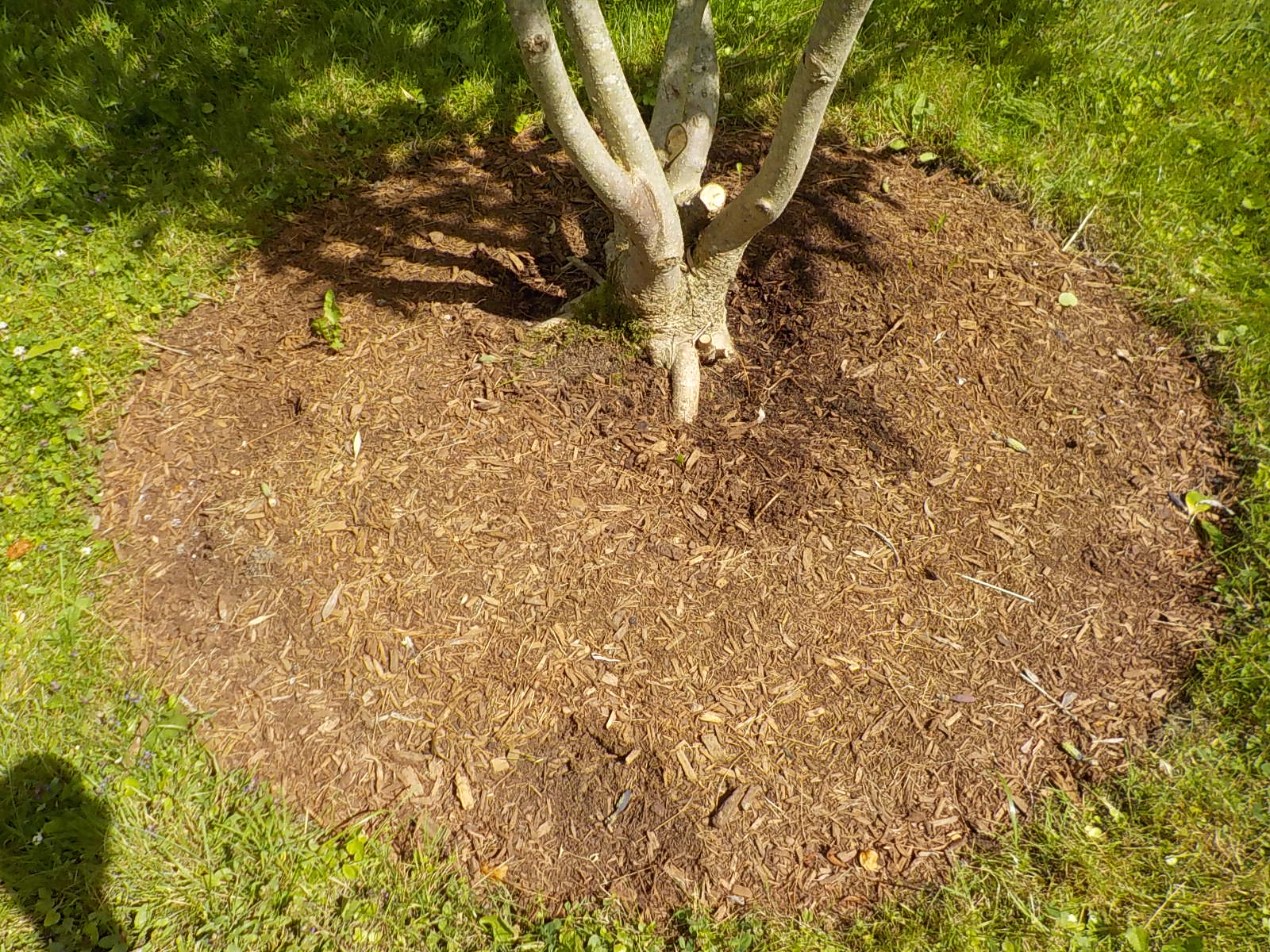 Keep mulch from touching the tree. This ring will keep mowers and trimmers away from the trunk.