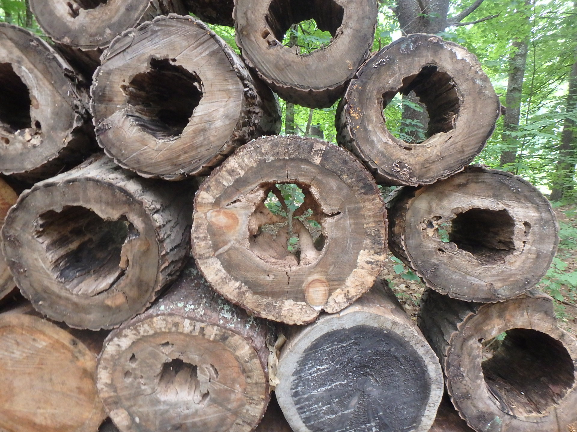 Jill Nooney has used plants in ways that surprised me. So for example, she used ‘Bulls Blood’ heritage beets in a flower bed for their deep purple leaves. An annual effort, but very striking. When a hollow tree was cut down, she had Bob cut it in two-foot sections and stack the sections between two trees so viewers walking by could see through it like binoculars. One can see where branches had been swallowed by its growth. They call it “Log Jam.”