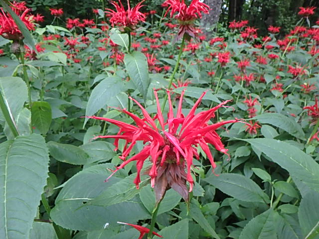 My beebalm ( Monarda didyma ) is just coming into full bloom now, and is deliciously fragrant. It is in the mint family, with a square stem that is relatively fragile. But they make great cut flowers, in part, because of their fragrance. Bees love them (hence the name), but hummingbirds do, too. Mine grow to 5 feet tall.
