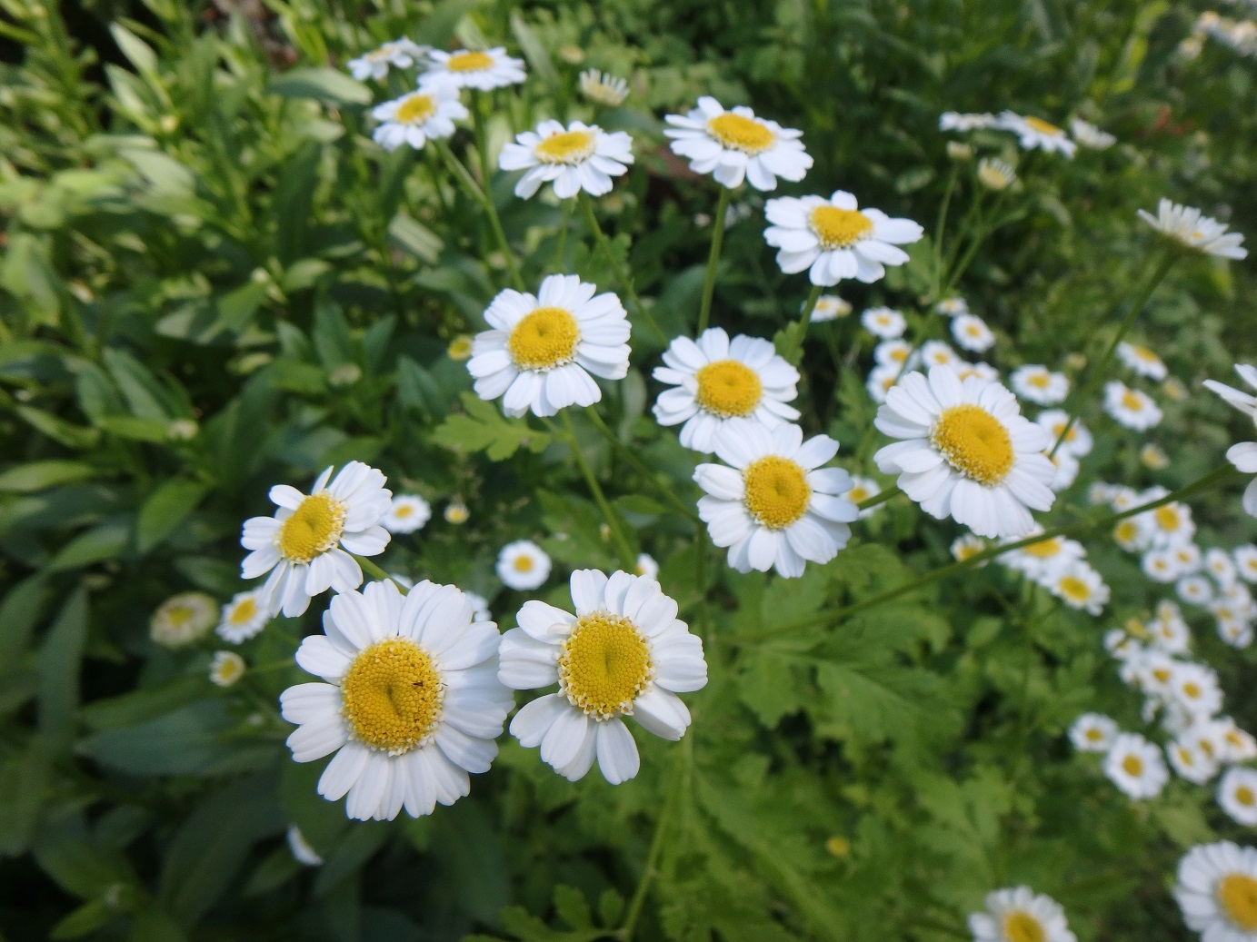 whim, is feverfew ( Tanacetum parthenium). Feverfew has white daisy-like flowers with a yellow center, each blossom just three-quarters of an inch across, but appearing in vast numbers. It is a short-lived perennial that sows seeds freely, so if you don’t want more plants, cut off the flowers before the seeds are dropped.