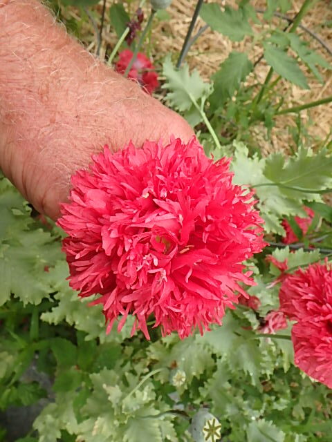The first flowers I see when I walk out my front door are poppies. Annual poppies ( Papaver somniferum). I didn’t plant most of them, or not this year. Each year I let them bloom and drop seeds after they’re done. They reward me with dozens of blossoms the following year. Sometimes I pick the pods and save to sprinkle seeds on the snow, an easy way to plant them in the dead of winter.