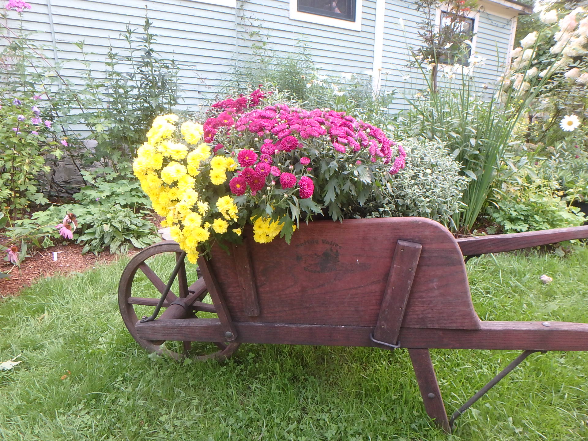Mums in pots tend to dry out quickly, so I have been soaking mine in my birdbath. That way the pots suck up water, getting it down deep. I could actually plant my mums in the ground, but I like them in pots on the front steps or in my wooden wheelbarrow. They need water every few days.