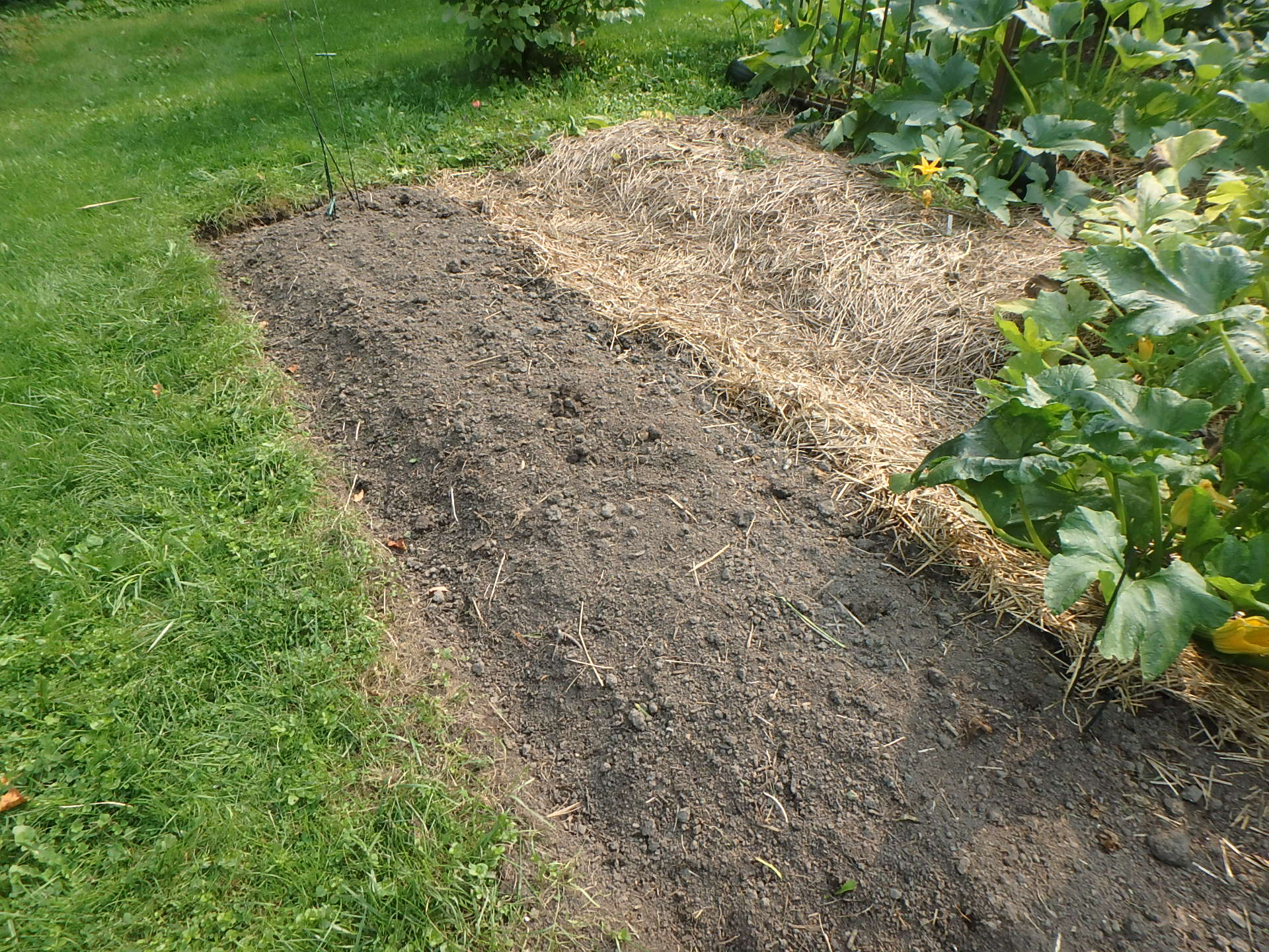 The vegetable garden is winding down, and as each crop is harvested, I weed the row and apply mulch as needed it to keep wind-blown seeds from finding a home. My favorite mulch consists of chopped fall leaves: I run over leaves on the lawn with my lawnmower to chop them, and rake them onto a tarp which I drag down to the vegetable garden. It’s too early for leaves, so I’m using straw for now.