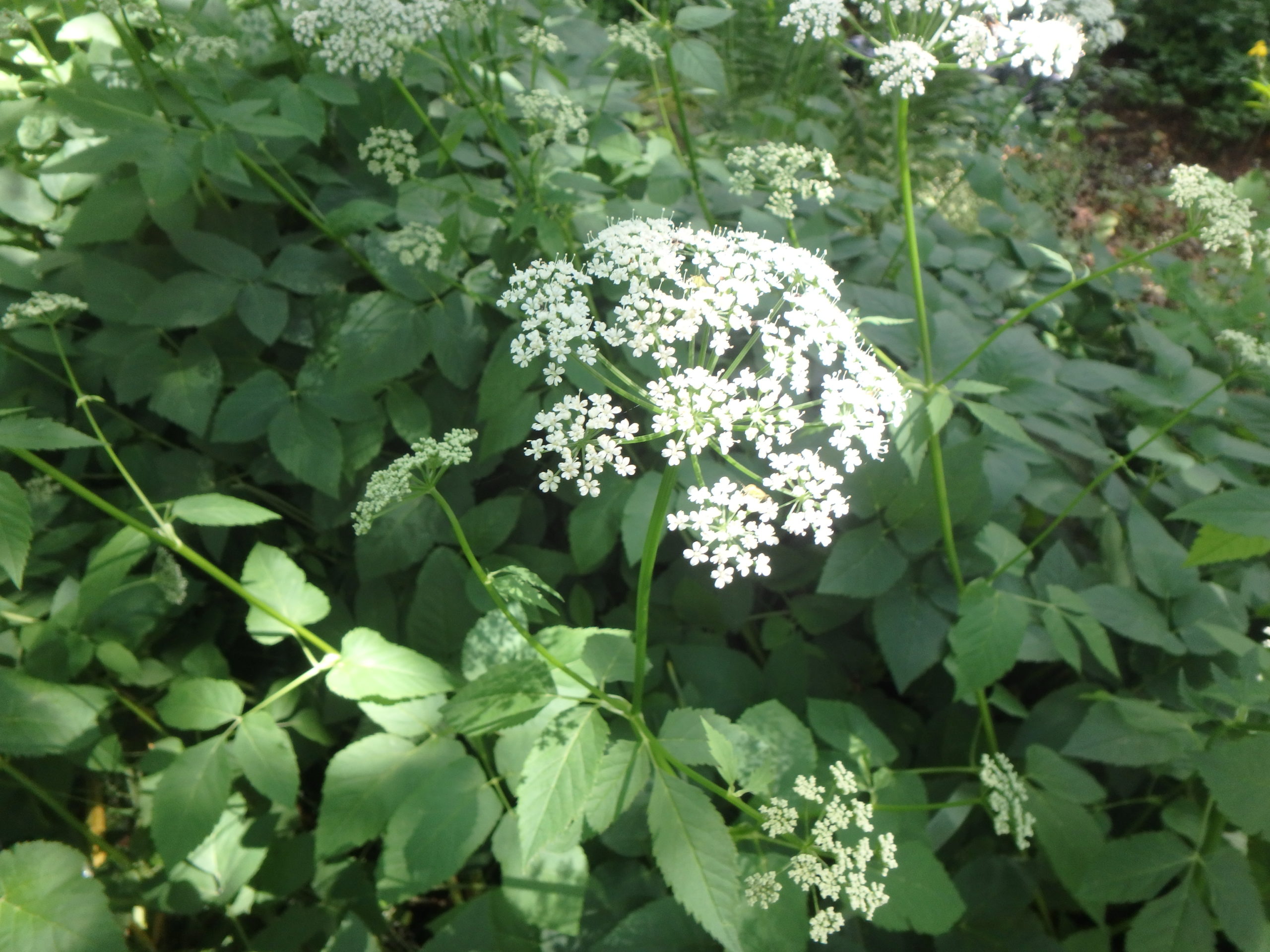 Another nasty weed is called goutweed (Aegopodium podagraria). There are 2 forms: an all green variety and a green and white variety often called ‘Snow on the Mountain’, which is sometimes sold by garden centers (though it should not be). The green and white one is possible to control, but the all green one is almost impossible to eradicate. I got goutweed when a friend gave me some iris with roots of it mixed in. The long white roots are insidious –they break easily and a scrap will generate a new plant.