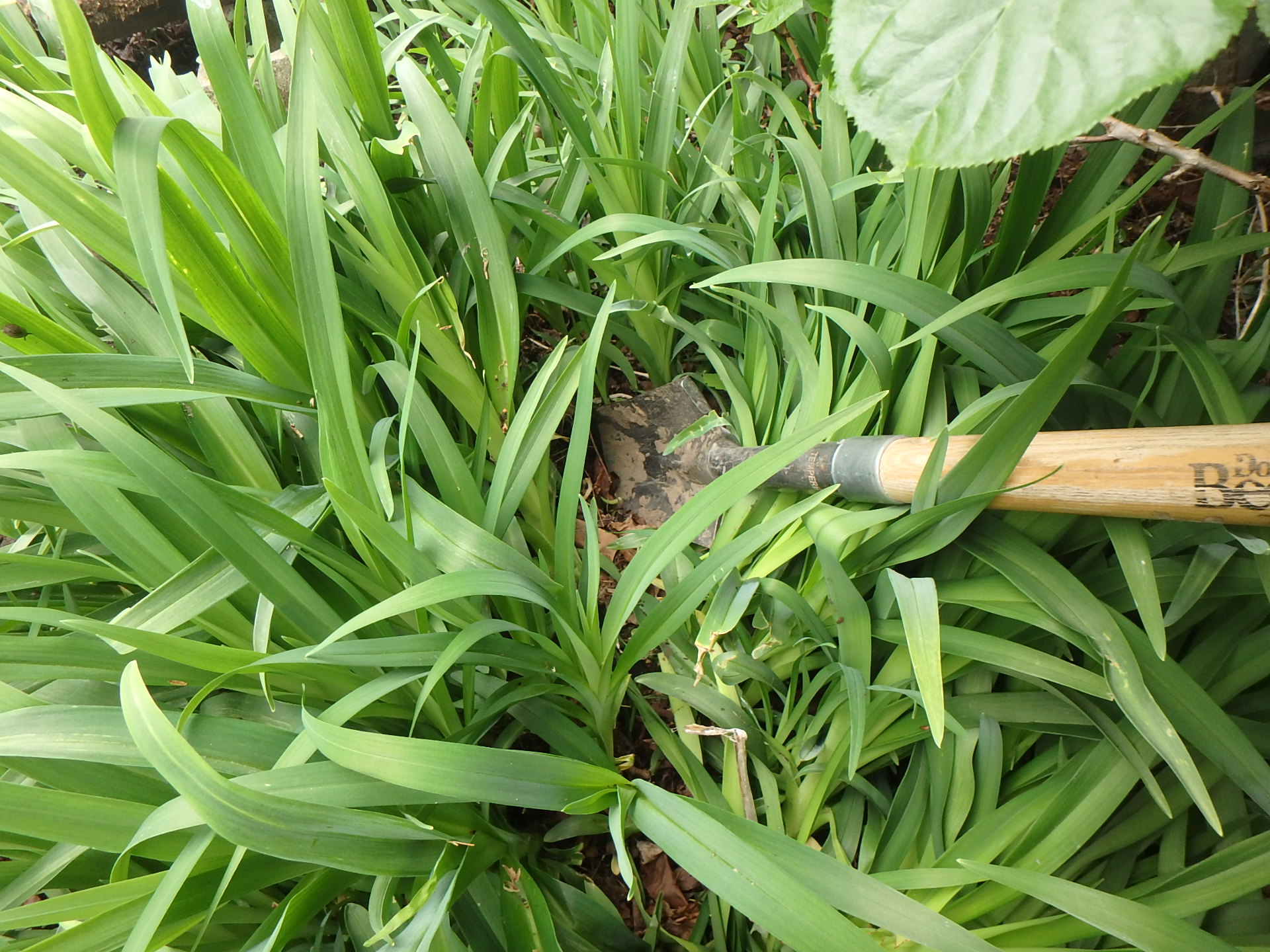 You can cut out a section of a large hosta or daylily by cutting out a wedge with a spade or even a long knife. I sometimes use a serrated root knife I got from Lee Valley Tools. Tracy DiSabato-Aust prefers a non-serrated knife, so I guess either will work just fine. Get down on your hands and knees and try to see natural division points before you cut.