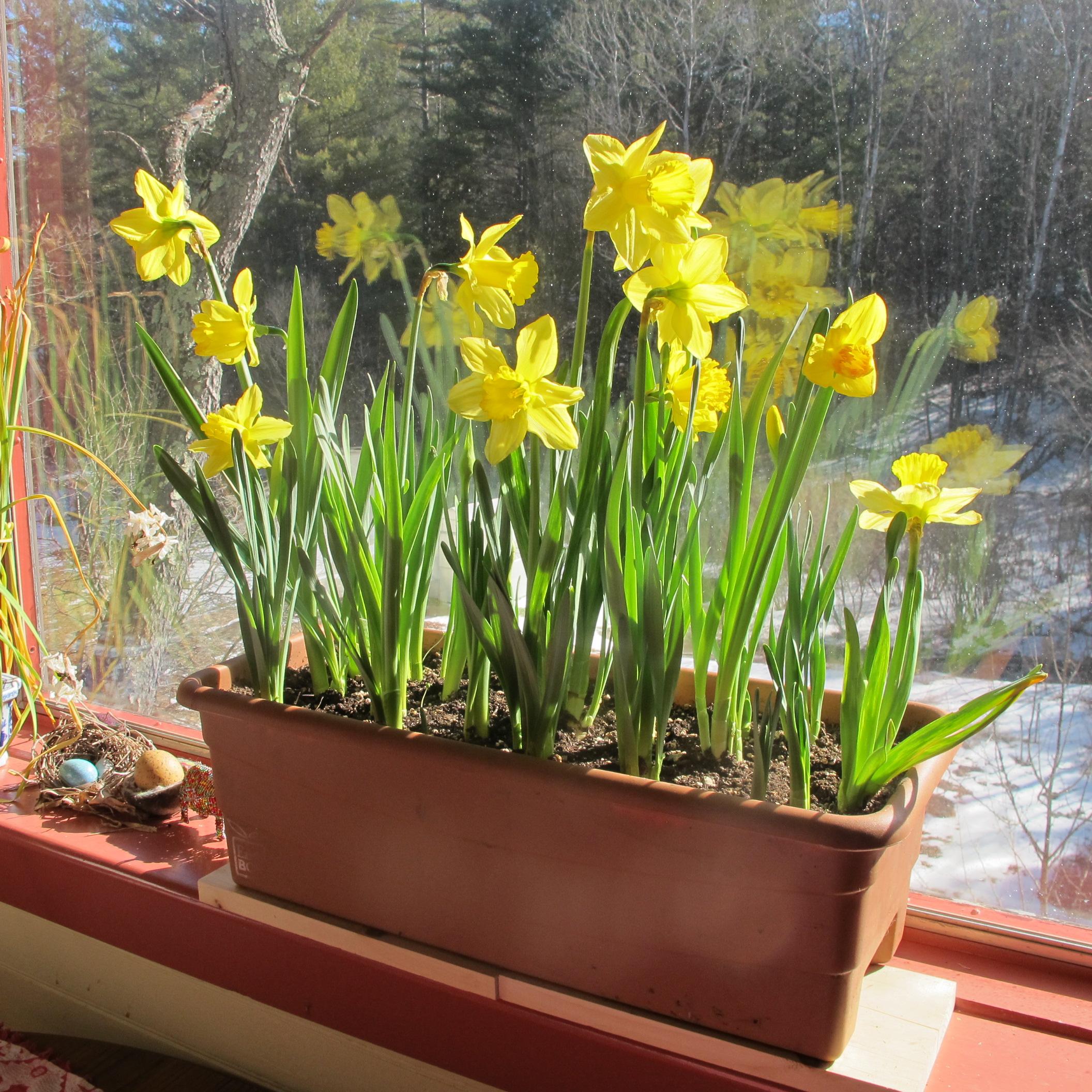 I planted 25 large daffodils in my window box, which was a bit of a squeeze, but will be dramatic when they bloom. Some years I plant 2 or 3 varieties of daffodils in it to stagger the bloom time, but this year I went for the “Big Bang” look – all blooming at once. I will bring the box out of the cold basement in early March.