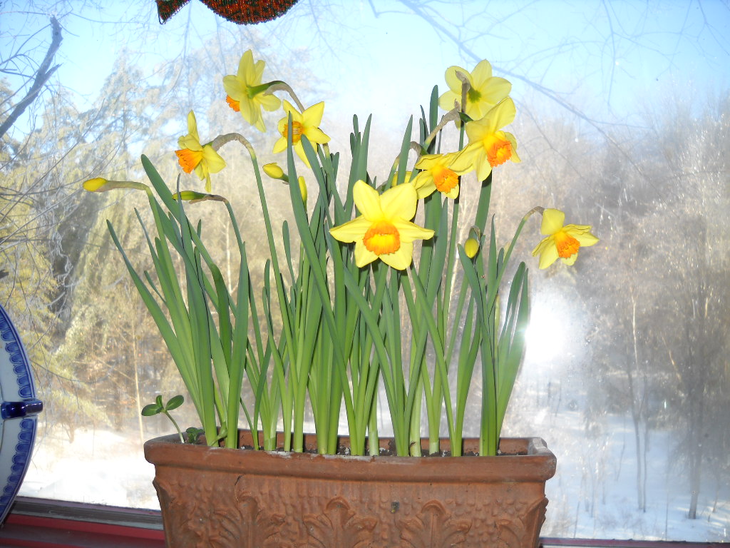 When it is time to bring up your potted bulbs into a warm place, let them wake up gently. My mudroom is good for starting them: there is some sunshine but it is cool. Then, once the shoots are up and green, I place the containers on my sunniest window sills – either east or west facing.