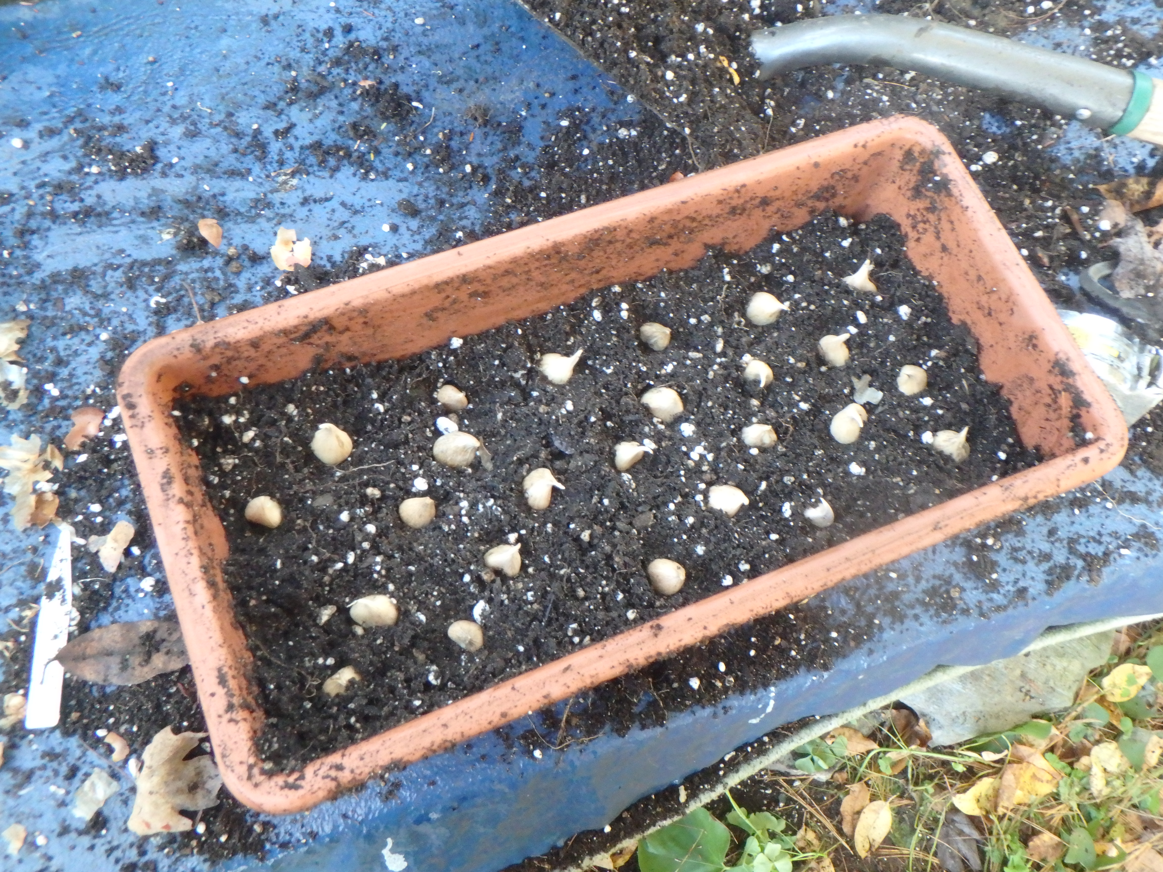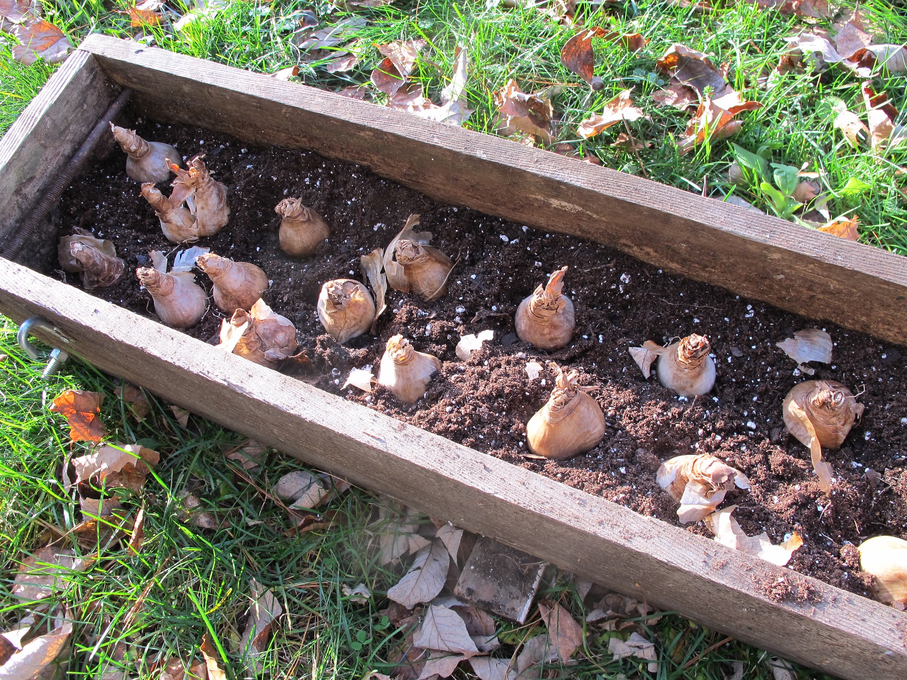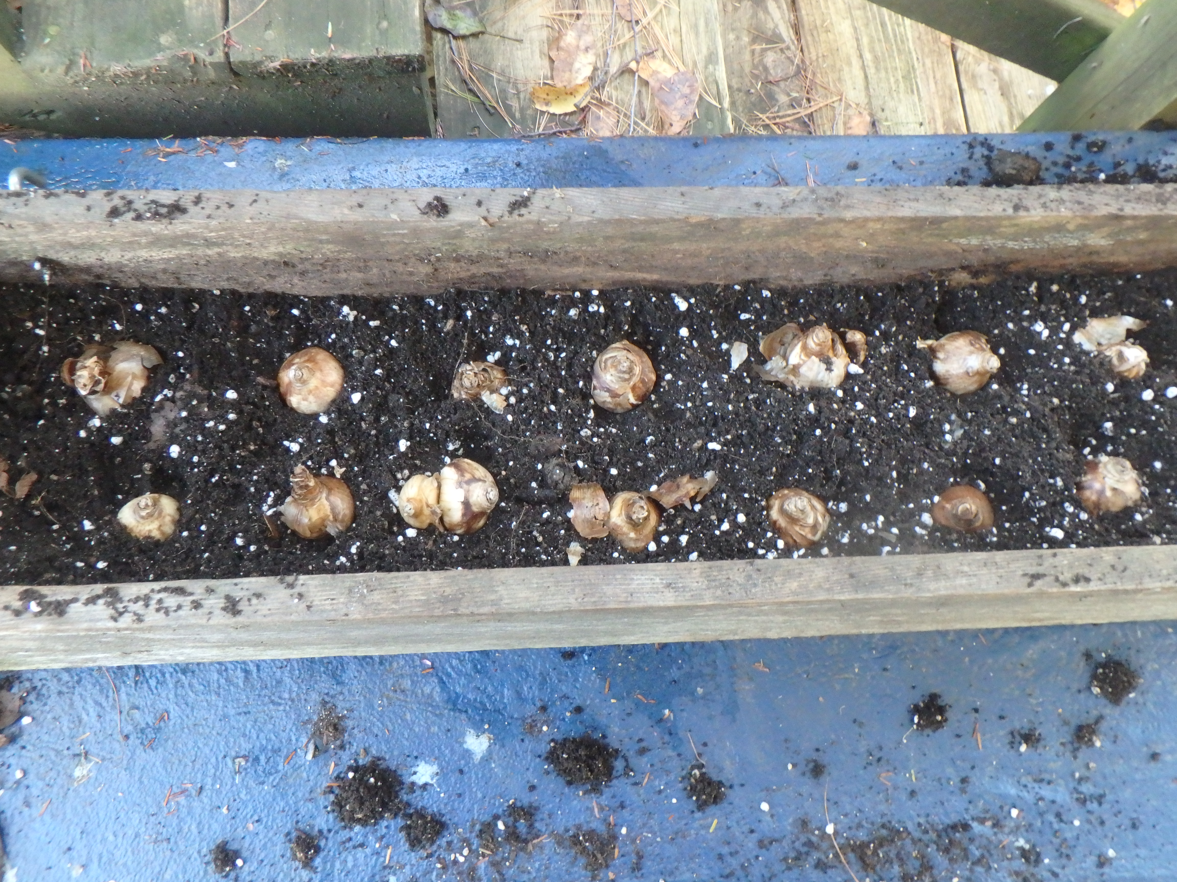 I fill the window box a little more than half full with my mixture of compost and potting soil and place the bulbs, pointy end up, in the soil. Once I have them all in place I push them down more and fill up the box with more potting soil-compost mixture.