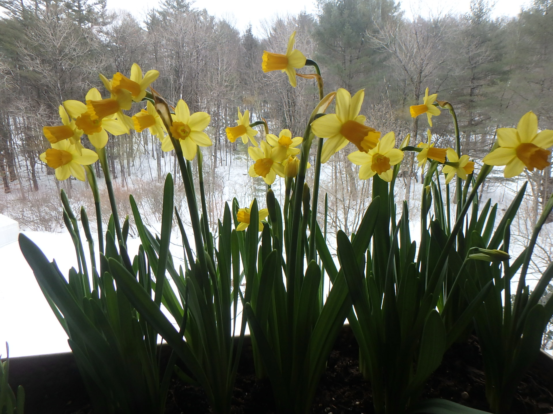 I recently planted 25 daffodils in a window box that is about 30 inches long, 6 inches wide and deep. It was a mix of different kinds of daffodils. I prefer to get all of one kind so that they all bloom at once, but the mixed bag was what was available (and on sale).